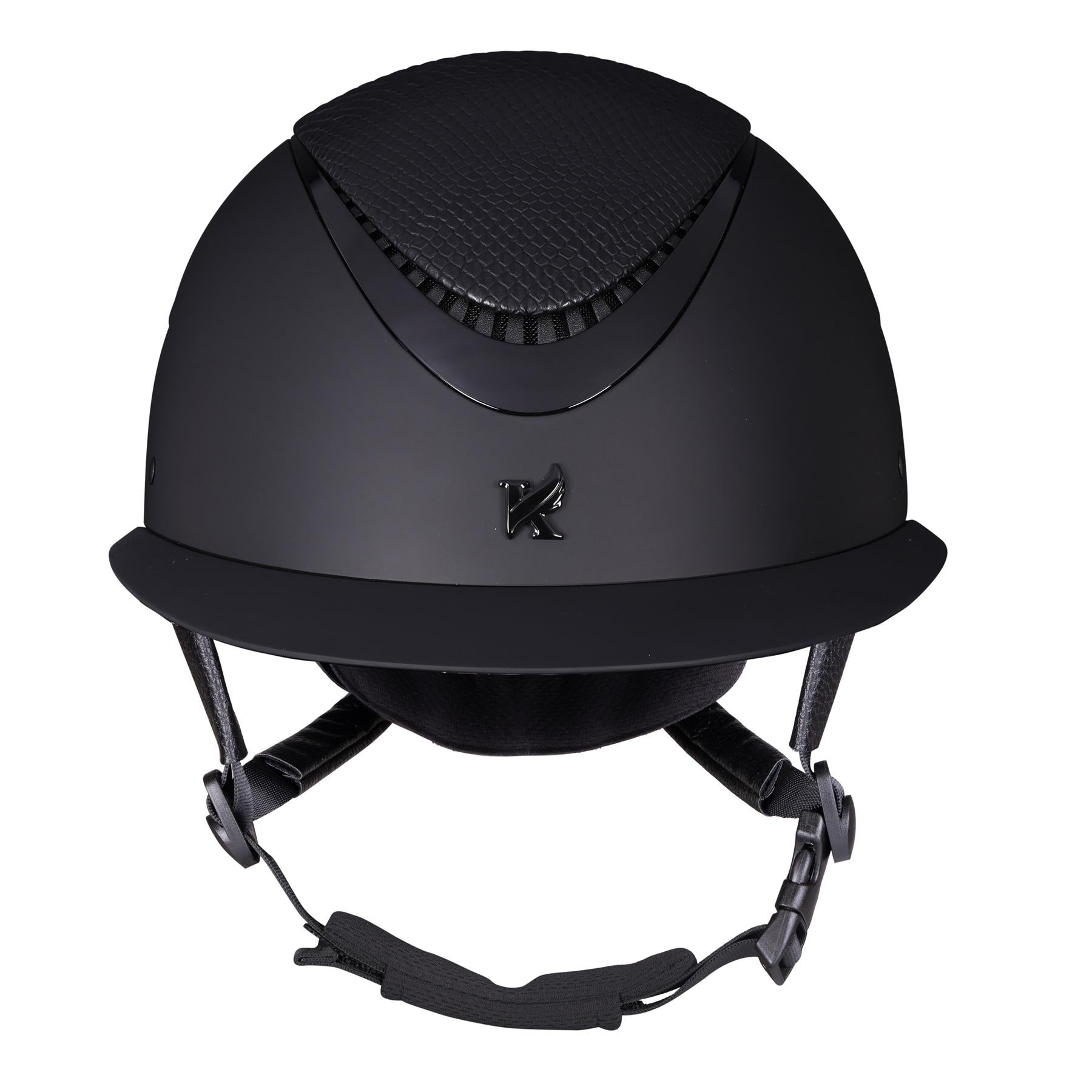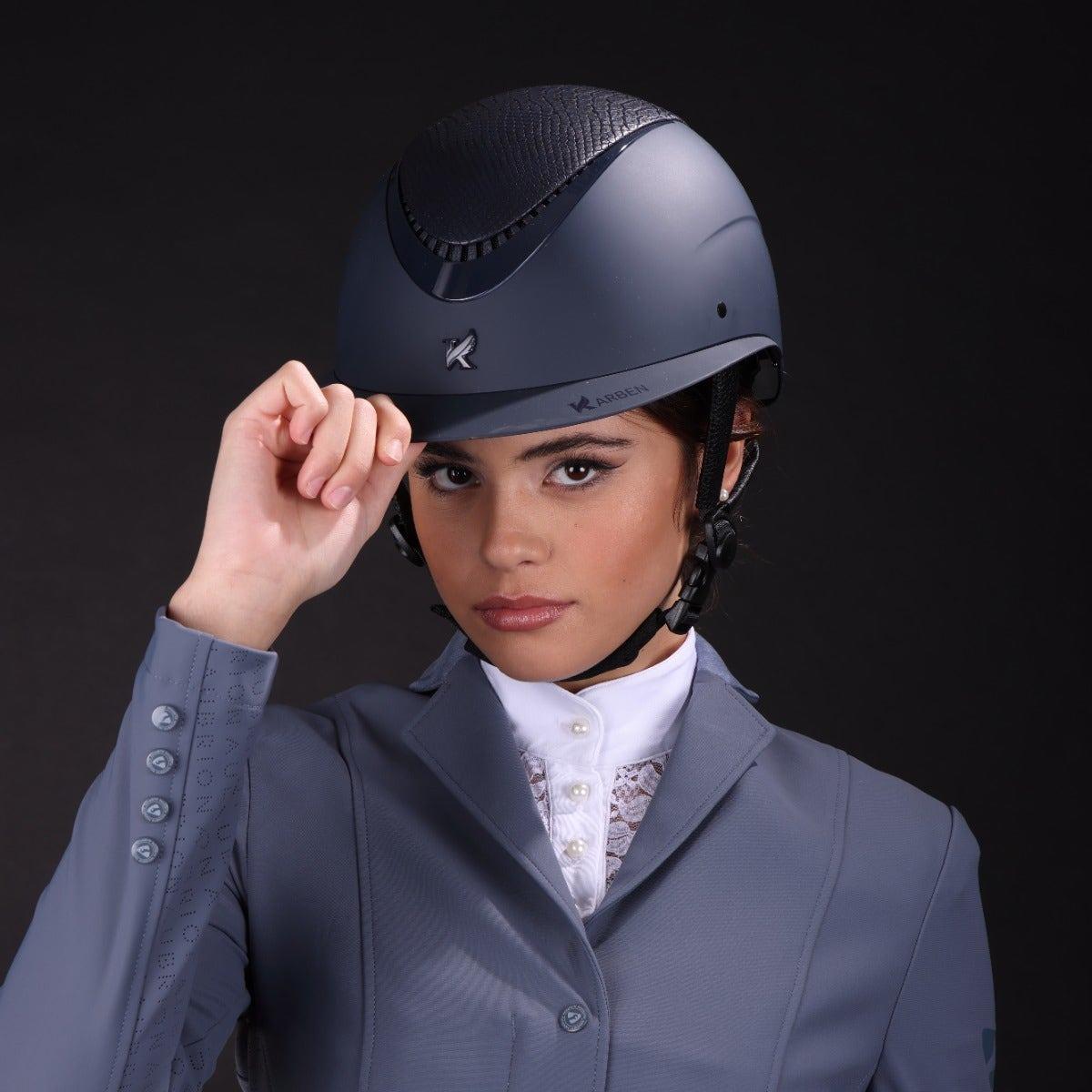 Fine tune your fit with dial adjusted Karben Ellipse riding hats. Lorah offers grown-up style with understated elegance. Faux snakeskin detail in the crown is gracefully set off by the high shine frame and matt shell. Designed with carefully balanced geometry, the wide peak frames the face, the low profile sits deep on the head. FINER DETAIL: Scratch resistant carbon wrapped rim. Velvet touch under peak lining. BESPOKE FIT Micro Adjustable Dial System. PASSIVE VENTILATION SYSTEM air channels vent towards the head. SHOCK ABSORBING expanded polystyrene inner shell engineered with targeted ventilation shafts. Flexible fixed peak for impact energy absorption. Deeply padded COMFORT LUXE LINER with CoolDryTM headband and THERMOREGULATING 3D mesh crown. Fully adjustable 4-point harness with soft faux leather wrapped sides. Quick release buckle. Removable anti-rub chin guard. Machine washable linings. Reusable drawstring storage bag. CE & UKCA BSI Kitemark PAS 015:2011 and VG1.