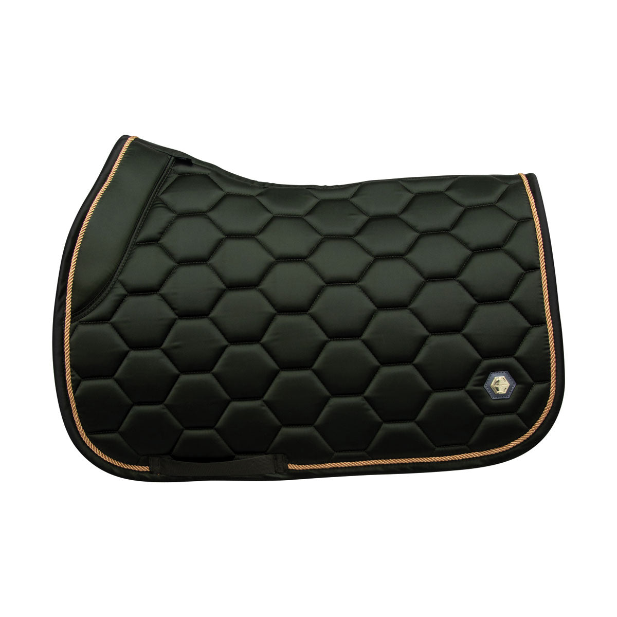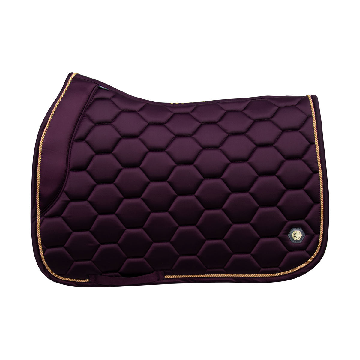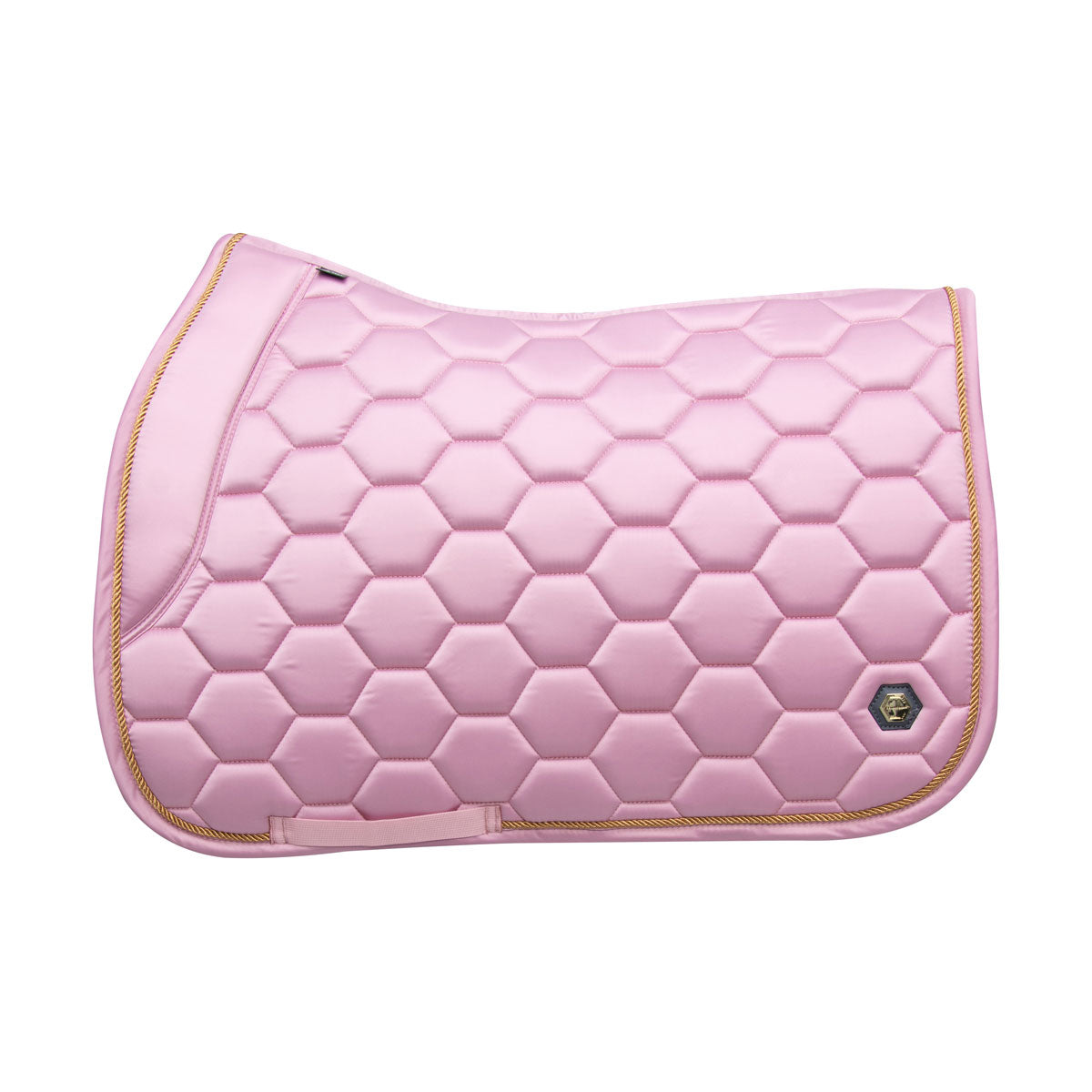 The luxury Marygold Saddle Pads are meticulously crafted from a deluxe silk material with hexagonal logo quilting for a classy and sophisticated style. These pads have been anatomically designed with a high wither that is supported by unique memory foam stop cushions. These provide optimum clearance and comfort which allows for a secure fit and freedom of movement, therefore assisting with improving performance. The moisture-tec lining ensures breathability and airflow when your horse or pony need it most, which when partnered with the quilted design assist with relieving pressure from under the saddle to even distribute weight. Golden pin detailing with leather backing and delicate gold braiding finish off this stunning saddle pad for a high-end look and feel. Perfectly matches with the Marygold horse wear and Ednam rider wear for an on-trend co-ordinated style.