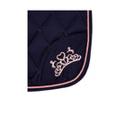 Perfect for any pony loving princess! This magical saddle pad features the Princess and the Pony rose gold glitter design, pretty peach binding and stitching and diamond shaped quilting. A girth strap and touch tape straps on either side of the pad keep it securely in place. Finished with a woven Little Rider label on the spine. A matching fly veil is available.