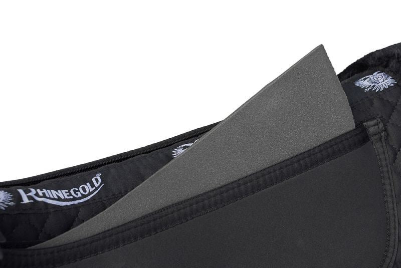 High quality, densely quilted cotton half pad with removable foam pads. 100% breathable cotton outer and lining. Shock absorber chloroprene rubber pad with touch tape pocket to add interchangeable pads Easy positioning of additional pads due to entire top edge of pocket having touch tape Supplied with 2 pads 100% Faux Fur Touch tape closure girth secure strap