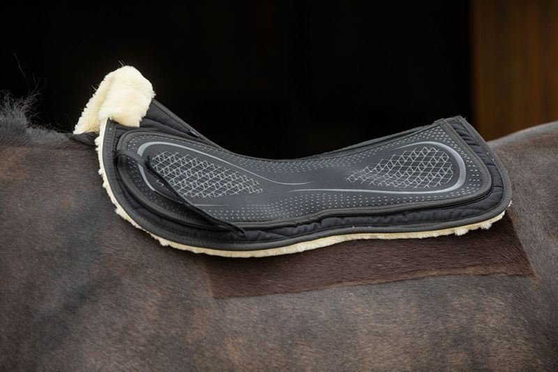 An innovative general purpose silicone topped saddle pad range, crafted from a combination of technical gels, anti-slip technology and quality cotton fabric. The shock absorbing neoprene upper has a silicone grip that has been designed to fit neatly under your saddle, helping to reduce any unwanted movement. Luxe fur trimmed and fully lined for absolute comfort. This upper section also contains a system of memory foam additional pads if needed. Supplied with one pair of 5mm slim ventilated full length pads, one pair of 3 slim ventilated pads to select particular area and the same in 10mm memory foam. These insert pads offer complete flexibility for adjustment and additional cushioning under the saddle. The pads are secured within three compartments to transform this saddle pad into a front riser, back riser or correct any bi-lateral imbalance; finished with a discreet touch tape closure. Highly padded Neoprene saddle pad Interchangeable Memory Foam Pads Silicone Non Slip Surface Supplied with 2 sets of 5mm slim foam pads Supplied with 2 sets of 10mm foam pads