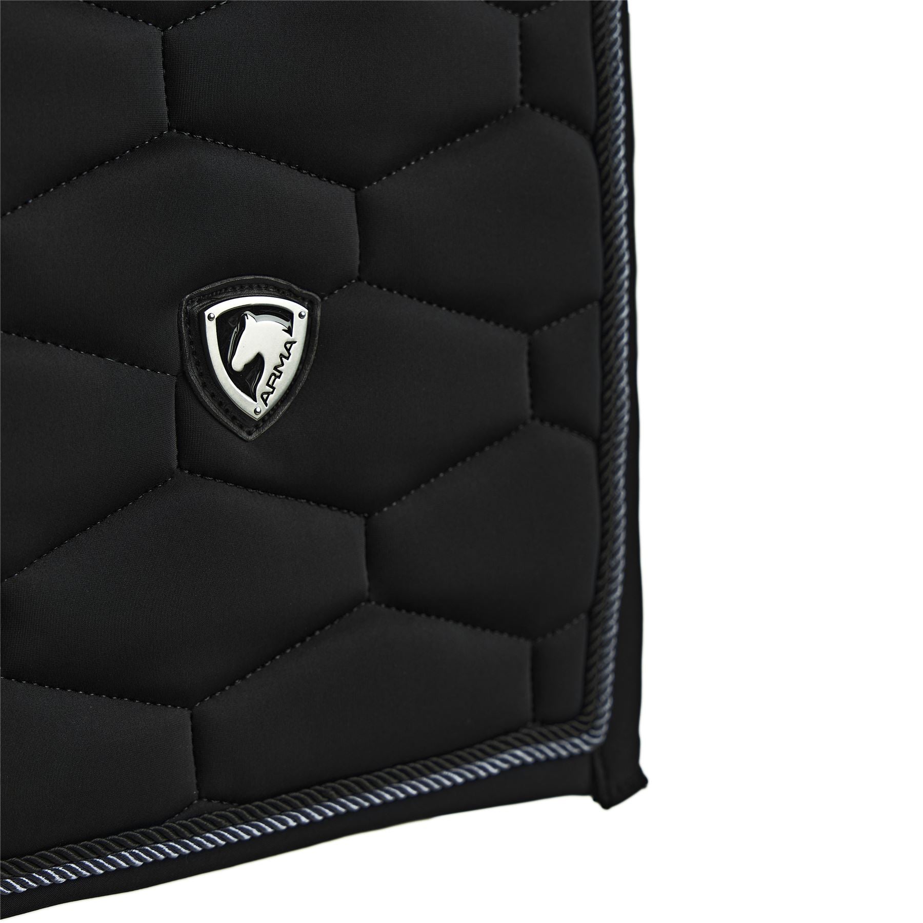 Make a bold statement with the Eltar saddlecloth collection. An elongated honeycomb quilt feels fresh and adds a luxurious feel. Deep colour quality is enhanced with a matte finish and twisted twin trim. The dressage cut is suitable for use under straight cut saddles, the contoured shaping ensures good clearance at the spine. ULTRA DRI ZONE lining instantly wicks sweat from the horse to reduce the risk of rubbing and increase comfort. The PU ARMA contour pro girth guard protects heavy wear areas, jacquard logo tape looks smart at the spine, girth loops and elasticated D-ring straps. A smart metal ARMA badge finishes the look. Machine washable.
