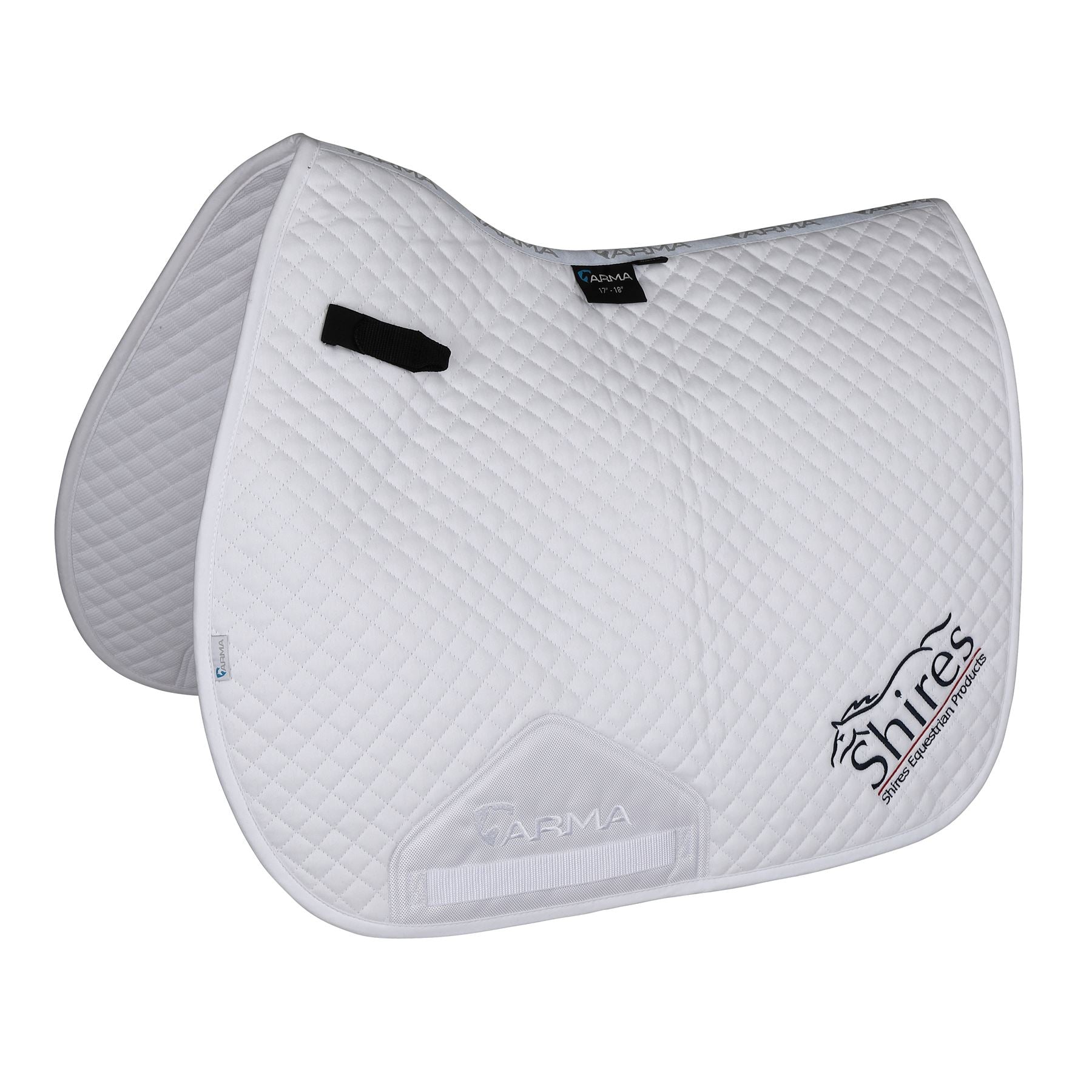 Prepare for competition in style with the Shires Branded GP Saddlecloth. This smartly branded saddlecloth, endorsed by the #shiresprorider team, is crafted with a BREATHABLE stay-smart anti-pill 100% cotton outer, securing optimal practicality and durability. Ensuring your horse's comfort is our priority, hence the saddlecloth comes with an ULTRA DRI ZONE lining designed specifically to wick sweat instantly, reducing the risk of rubbing.