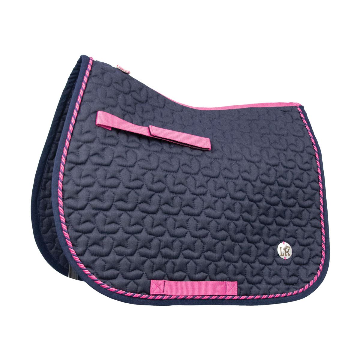 This striking navy star quilted saddle pad with matching navy and pink cord binding, features the Little Rider pin badge for a smart look. A pink girth strap and touch tape straps on both sides of the saddle pad help hold it securely in place. Finished with a woven Little Rider label on the spine. Matches the Little Rider collection.