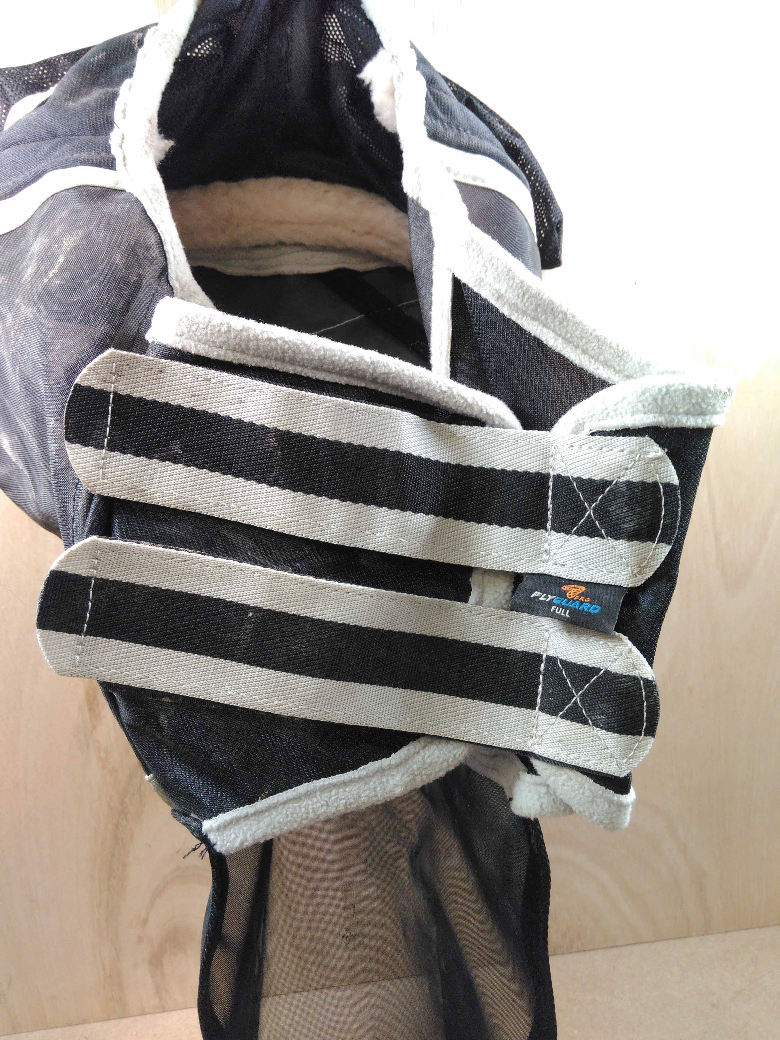 The Shires Fly Guard Pro is designed to provide effective protection against flies and other insects, featuring ears and a nose cover for added comfort. This full-sized mask is ideal for keeping your horse comfortable during warmer months, although it shows signs of use and may require cleaning before use.