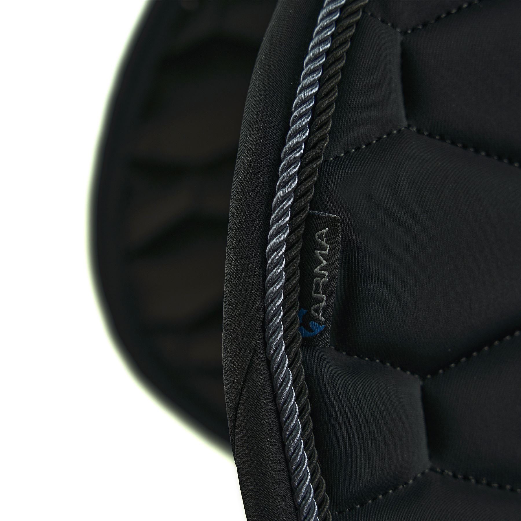 Make a bold statement with the Eltar saddlecloth collection. An elongated honeycomb quilt feels fresh and adds a luxurious feel. Deep colour quality is enhanced with a matte finish and twisted twin trim. The jump cut is suitable for use under a wide range of saddles, the contoured shaping to ensure good clearance at the spine. ULTRA DRI ZONE lining instantly wicks sweat from the horse to reduce the risk of rubbing and increase comfort. The PU ARMA contour pro girth guard protects heavy wear areas, jacquard logo tape looks smart at the spine, girth loops and elasticated D-ring straps. A smart metal ARMA badge finishes the look. Machine washable.
