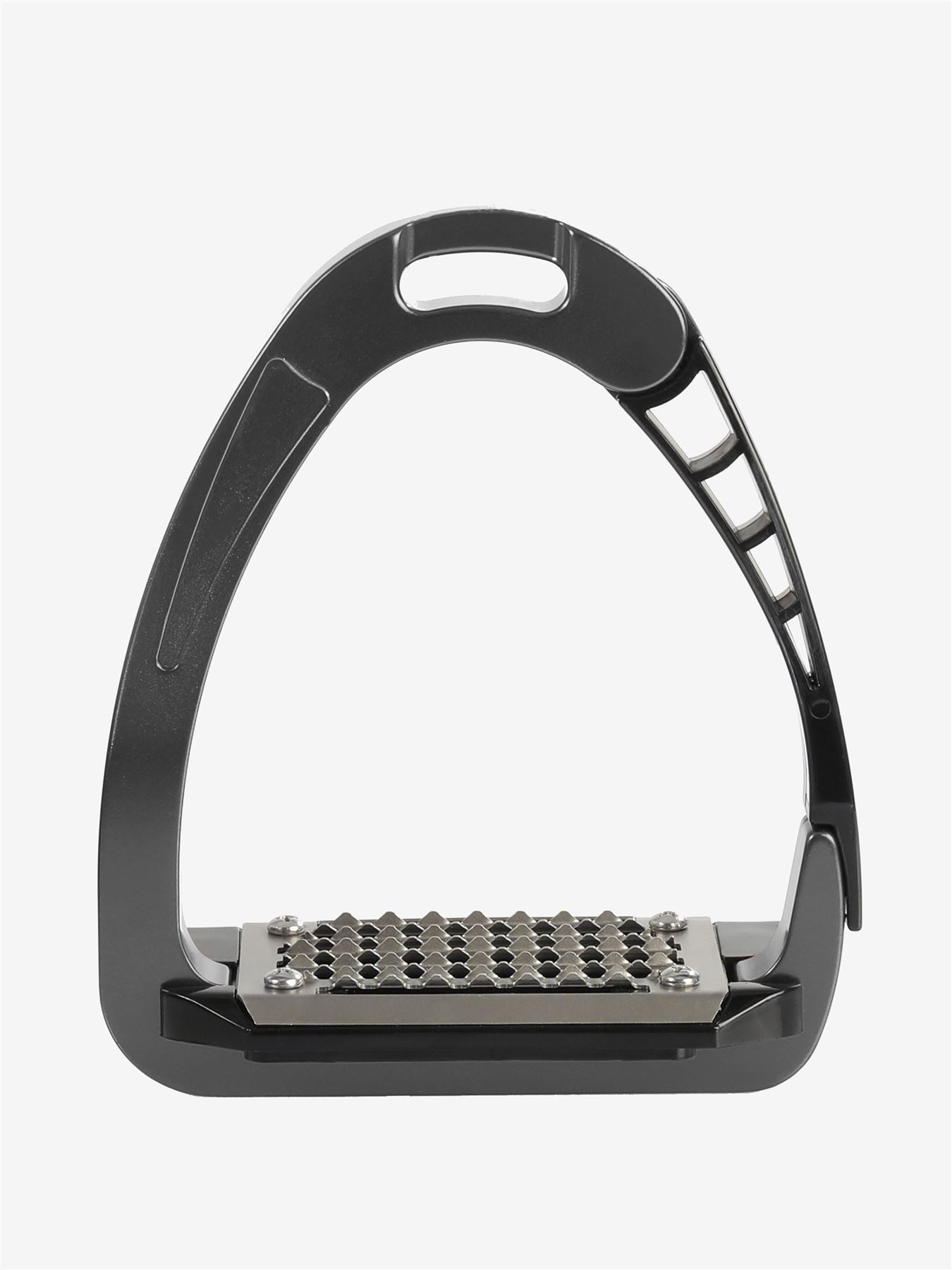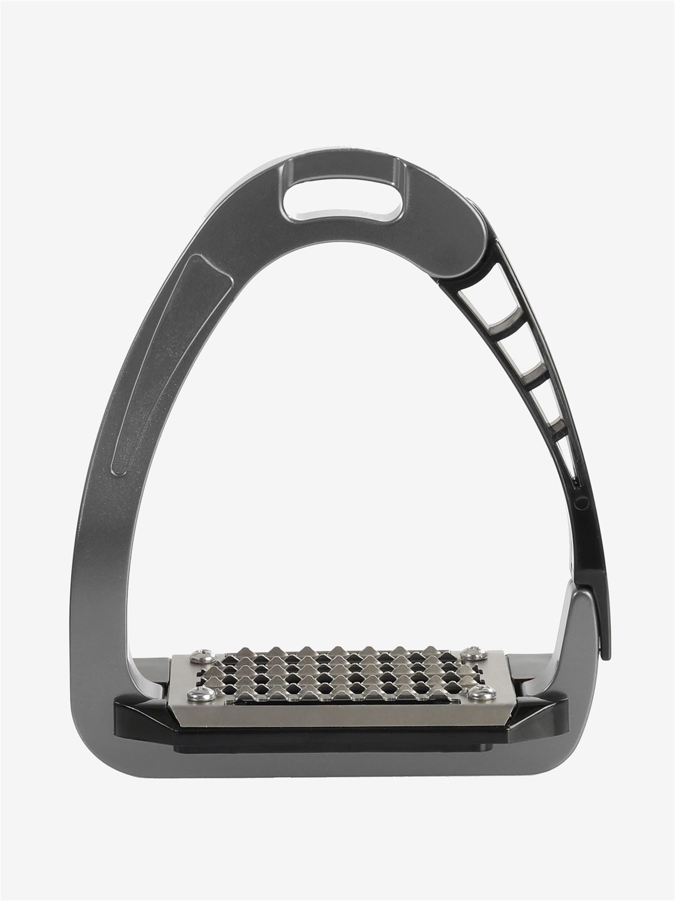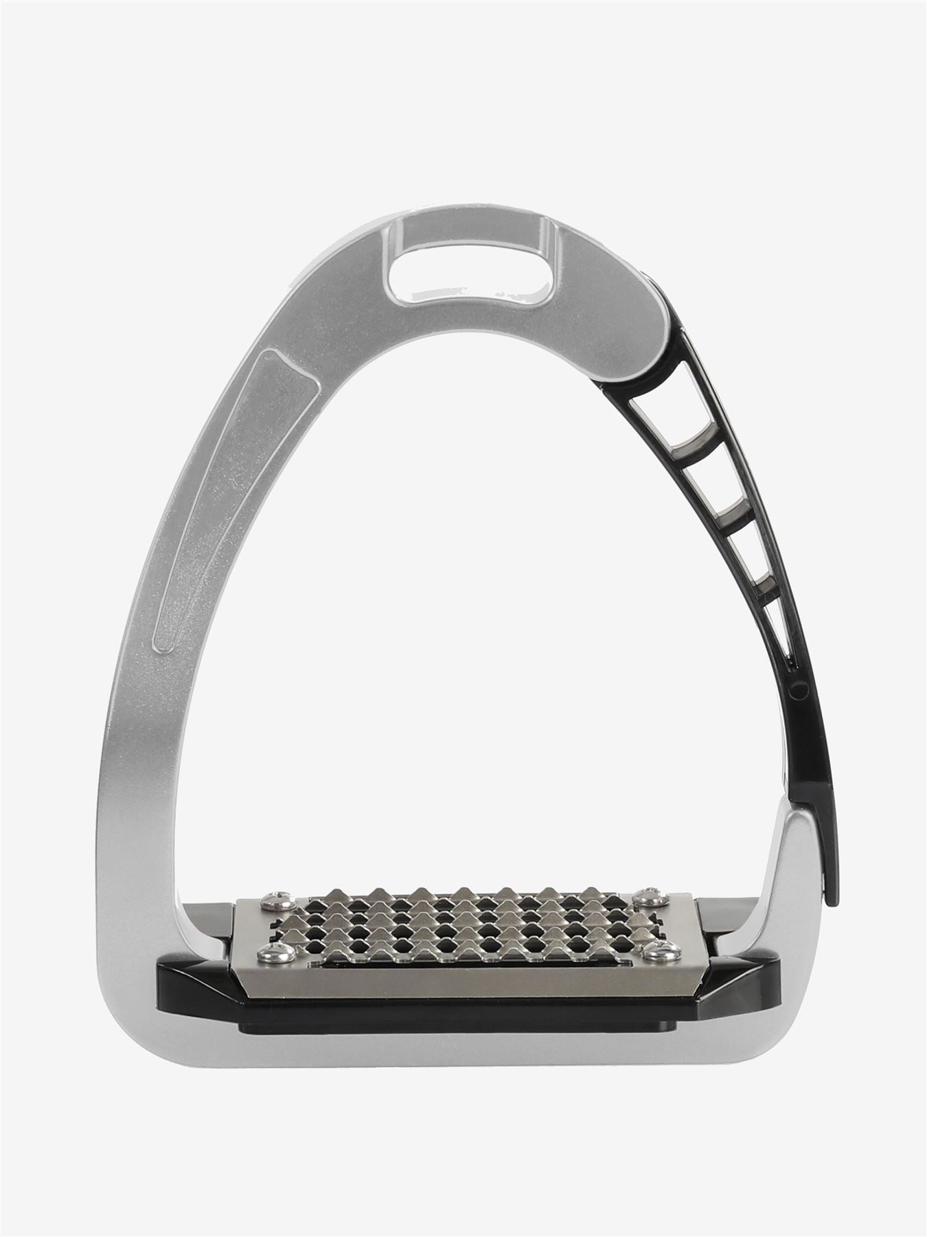 The stirrup bow is made of aluminium, while the opening arm is made of a special polyamide material. The stirrup pad is made of polyamide, too, and the tread is fabricated from stainless steel. The "AluPro" model, in principle, provides the same function as the Arena "HiFlex", but it is based on different materials. Main Features Unique, stress-actuated locking and release mechanism located between the lower end of the outer, pivoting stirrup arm and the foot support plate/tread. Easy and reliable "one-click" re-engagement of the stirrup locking and release mechanism once triggered. Special Spring Effect Due to its design and construction which is based on flexible polymers, the stirrup conveys a less rigid and much more comfortable feeling to the rider than with conventional products. The springing stirrup bow and foot support assembly is capable of effectively absorbing and compensating for short-term and sudden impacts exerted through the rider's weight from the top, e. g. during posting, jumping or hacking. Considerable benefits for the rider: strong relief of foot bottoms, ankles, knees and hips, therefore, also very interesting for riders suffering from orthopaedic problems.