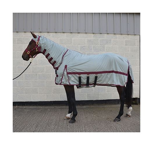 This Hy Polyester silver close weave mesh giving maximum protection against all flying insects. Fully protected to reflect harmful UV rays of sunlight. The cleverly designed neck fits over the ears to prevent it from slipping down. The rug offers fully adjustable elasticated touch tape neck straps plus a belly flap with adjustable elasticated straps. Features freedom pleats at shoulder, tail flap plus removable leg straps. Anti-rub lining on mane, tail and shoulder. Comes complete with a fly mask to protect the eyes and ears. Featuring an attractive Hy reflective logo. Machine washable at 30°C. Mixed binding - receive either navy or burgundy.