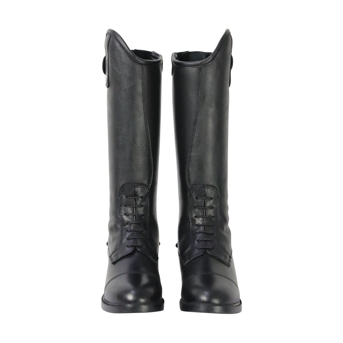 This stylish long boot is perfect for competition of everyday. Fitted with lace fronts for the classic field boot look and elasticated back panels for a streamlined fit, added comfort and ease of fastening. Featuring spur studs on the heel for optional use and press button spur guard to the bottom of the boot. These boots are finished with a zip fastening and top press stud closure and are fully lined for added comfort and sit on an anti-skid sole for added durability and stability.