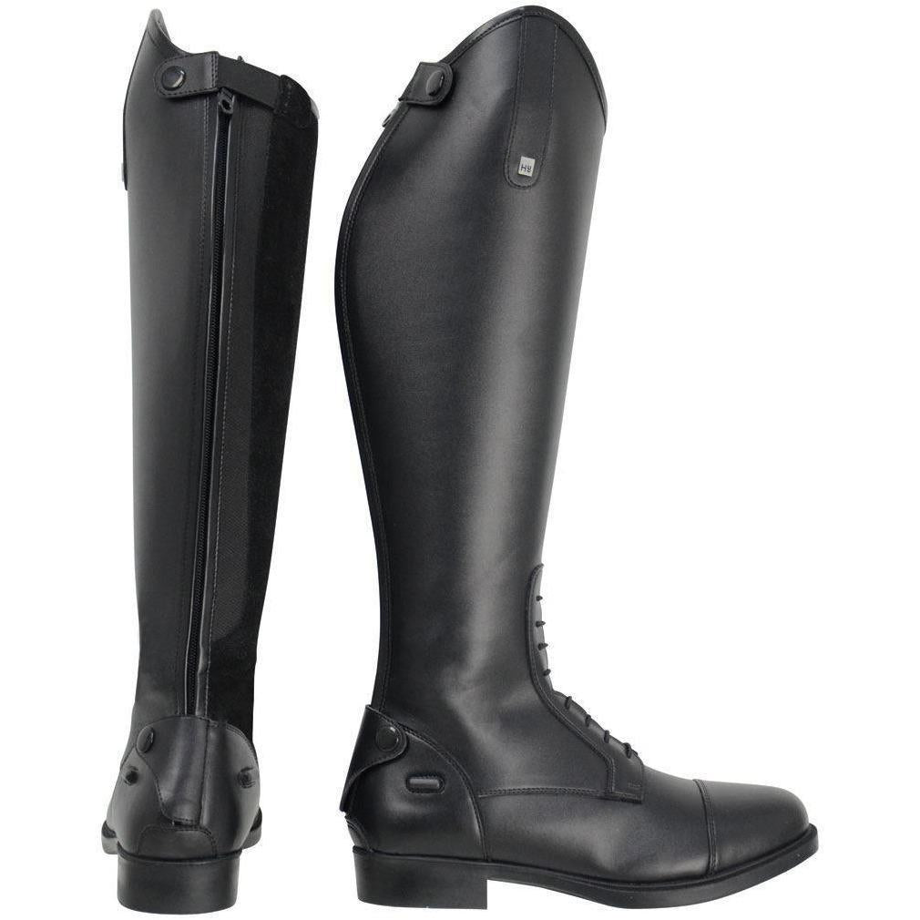 These smart & sophisticated tall boots feature a suede inner leg panel for added security. Fitted with lace fronts for the classic field boot look, these boots also benefit from an elasticated back panel; an adjustable design that allows for streamlined fit and comfort. The full zip is protected by a press stud spur guard at the bottom whilst a stretch panel to the top secures the zip when worn. A genuine leather foot is benefitted by two rubber spur studs and a suede panel on the inner leg, making for a secure grip and smart look in any sphere. A fantastic choice for any rider. All HyLAND boots come with boot boxes, with a handy handle for carrying to help create an eye-catching retail display.