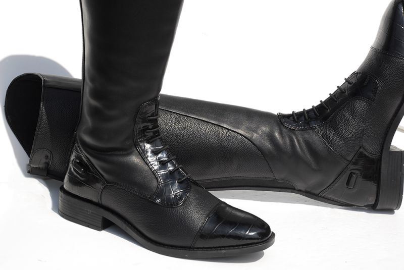 High end luxurious feeling boot with soft Nappa leather foot, textured leather inside calf panel and stretch material outer leg. Gives supreme comfort with an elasticated panel at rear of the boot and full length zip for ease of use. Trimmed with patent mock croc with front lace detail. A stunning boot Stretch outer calf Mock croc patent trim Front lace detail super soft Nappa leather Inside leg panel for better wear