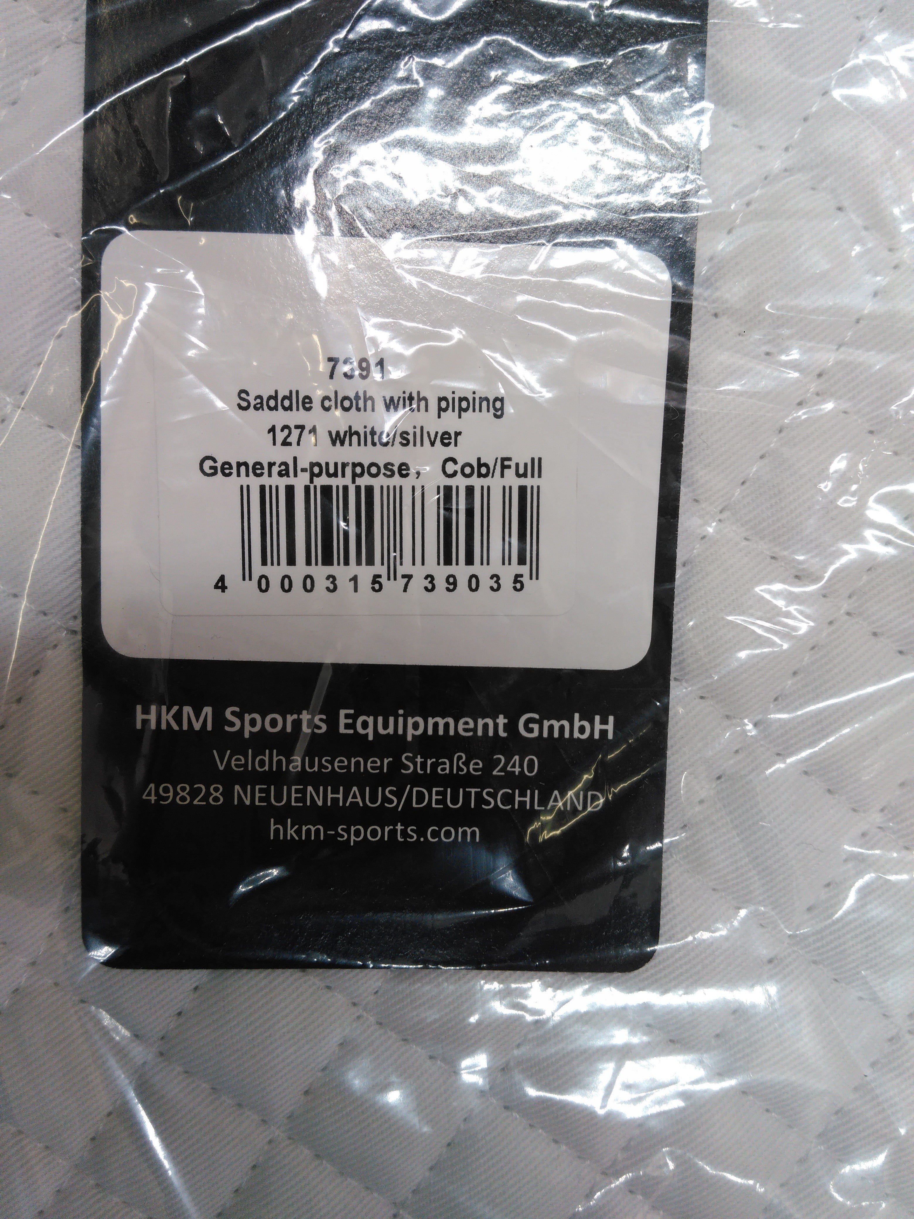 The HKM Saddle Cloth With Piping is designed for general purpose use, providing comfort and style for your horse. This elegant white and silver cloth fits Cob/Full sizes and features a classic piping detail, making it a perfect addition to your equestrian gear. Although discontinued, it remains a high-quality choice for both training and competition.