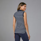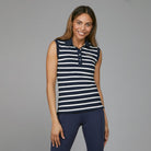 The Lucille sleeveless Polo Shirt is a classic, stylish design which has nautical stripes, a ribbed collar and cuffs and button neck opening. Crafted from soft stretch cotton and featuring side splits, gold trims and embroidery.