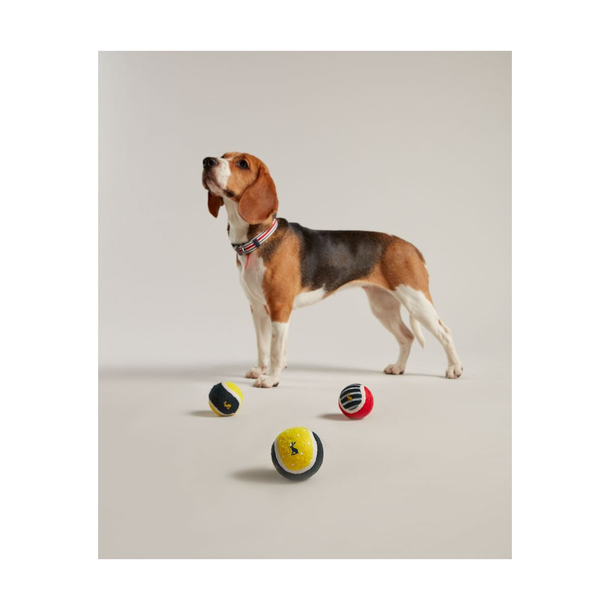 Three strong and durable rubber balls perfect for endless games of fetch. This contains three different ball designs and includes hanging net bag with the Iconic Joules Coastal design.