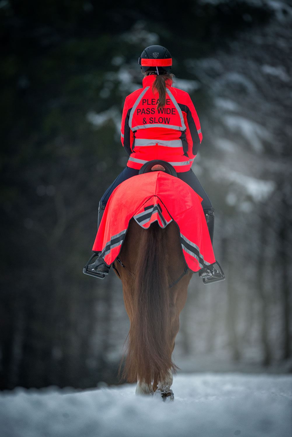 Hi-vis and 360 degree reflective, 100% waterproof, breathable and windproof. Lightweight with a quilted lining with a soft, thinly padded, wicking fabric. A fully adjustable, detachable chest protector is fitted at the top of the pommel area so it doesn't get in the way of the horse's movement. Cut very generously in depth, the unique, exclusively designed girth slits guarantee that the rug won't slip. Crossover leg straps avoided blowing up in the wind. Machine washable at 30 degree using a non-bio product.