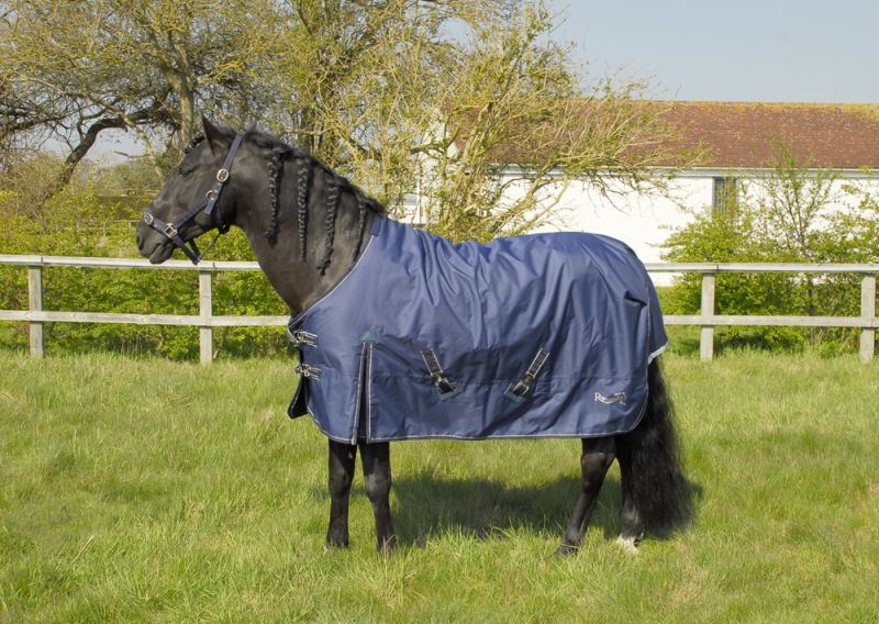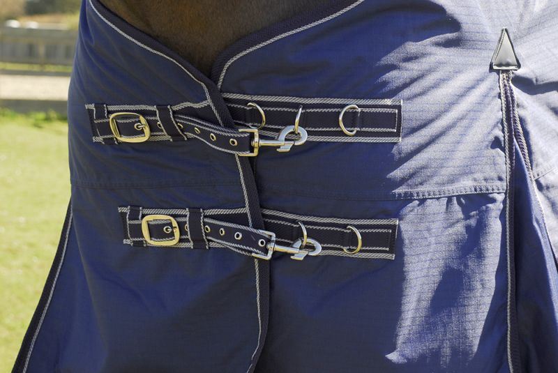 Extremely handy mid-season, this rug features a 600 denier ripstop, waterproof breathable outer. It has a mid/light 100gsm polyfill with a breathable nylon lining. Multi-adjustable chest straps, front shoulder gusset, cross-over surcingles, leg straps, no back seam, large pleated tailguard with reflective stripe and strengthened surcingle guides. A perfect weight for unpredictable weather in slightly warmer months. NEW MULTI ADJUSTABLE CHEST STRAPS NEW DAYGLO TAILGUARD STRIP BETTER QUALITY FITTINGS Taped seams Ripstop Waxed stitching Multi-adjustable chest Breathable Waterproof Large pleated tailguard with reflective strip 600 Denier 100gsm Polyfill Ideal Mid/light-Weight Turnout Rug Available in a full neck version see code 663 Ideal weight for horses that do not require heavyweight outdoor rugs