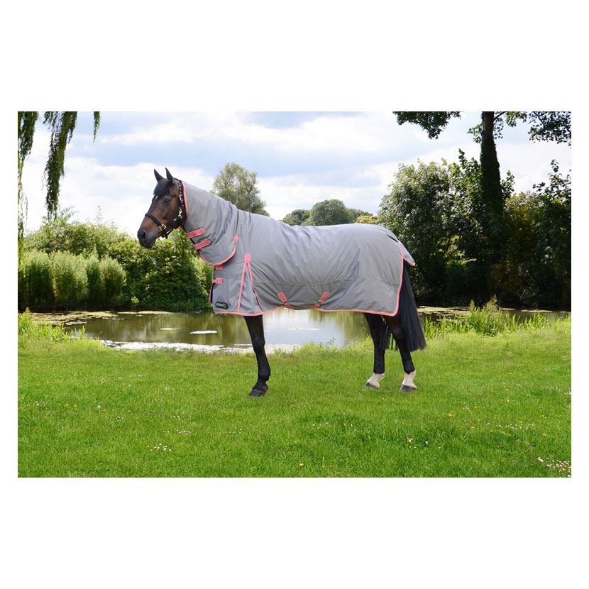 Beat the cold and wet weather with this heavyweight turnout rug. Your horse will be kept toasty and warm with the 300g fill and the 600 denier outer fabric will ensure your horse remains dry. A fixed neck cover and a large tail flap add extra protection from the elements. Touch tape fastenings on the neck and adjustable surcingle�s, leg straps and chest buckles keep the rug securely in place.