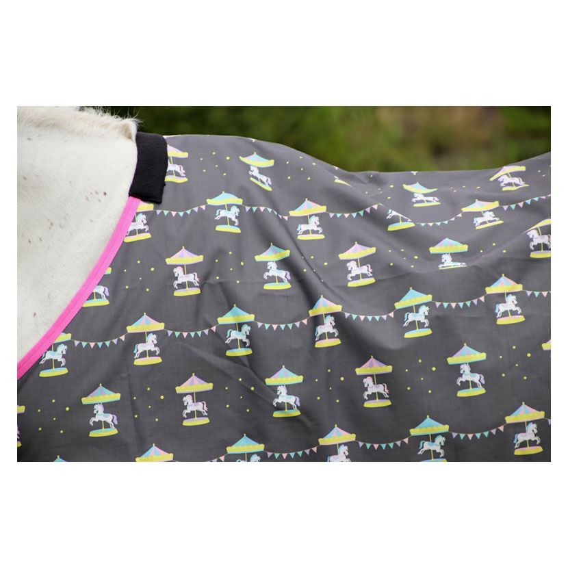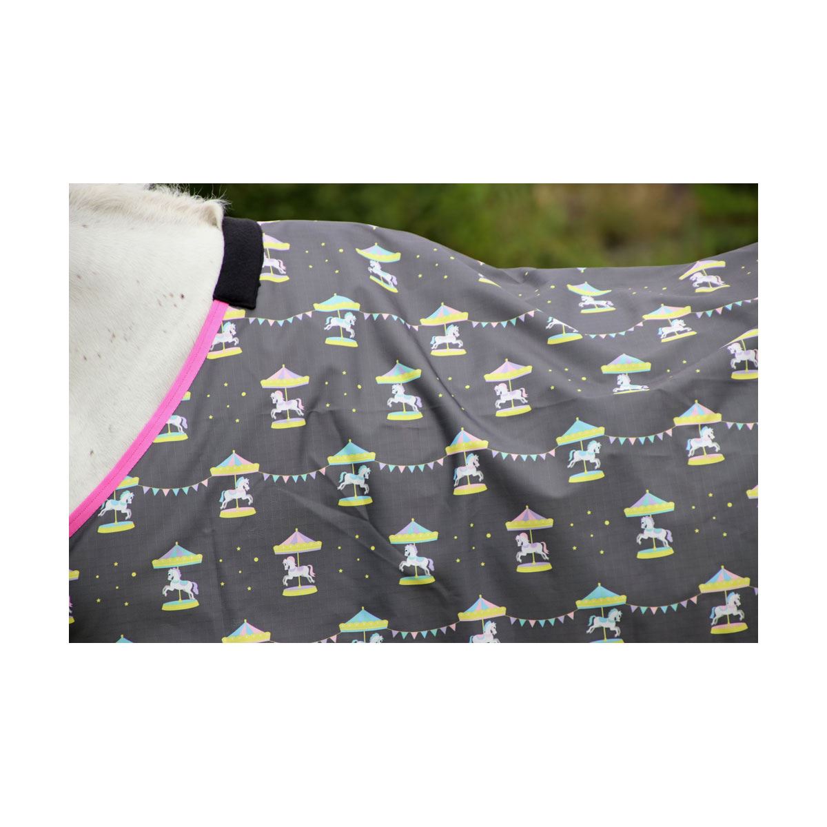 Part of the Merry Go Round collection, this funky rug is both eye-catching and practical. It features 600 denier, ripstop and waterproof material, ultra-lightweight reinforced stitched branded lining and 0g fill, enhancing breathability, as well as providing comfort and protection from the wet winter weather. Twin surcingle chest fastenings, adjustable cross surcingles and leg straps ensures the rug stays in place. A large tail flap adds that extra bit of protection. Designed with the Merry Go Round collection in mind, along with pink piping, it adds fun and colour to your horse�s wardrobe!