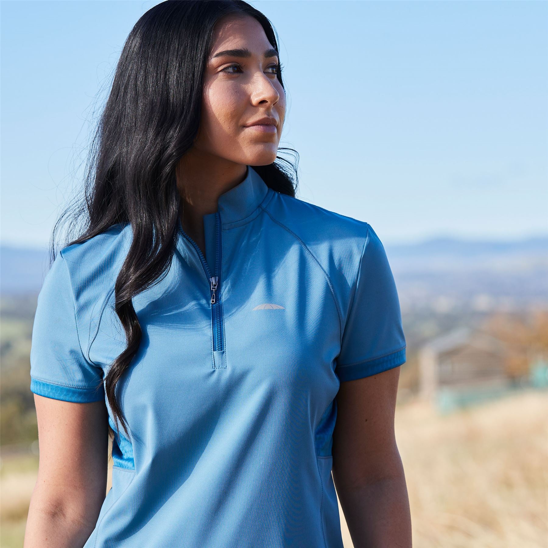 The WeatherBeeta Eden Short Sleeve Top is a textured technical top made from a recycled nylon blend for ultimate comfort. Featuring a 1/4 zip with stand collar and short sleeves, jacquard mesh trim upper side panels, upper back and cuffs for ventilation and side panel seams for a slim silhouette. The Comfort Dry Technology fabric provides moisture control for all day comfort.
