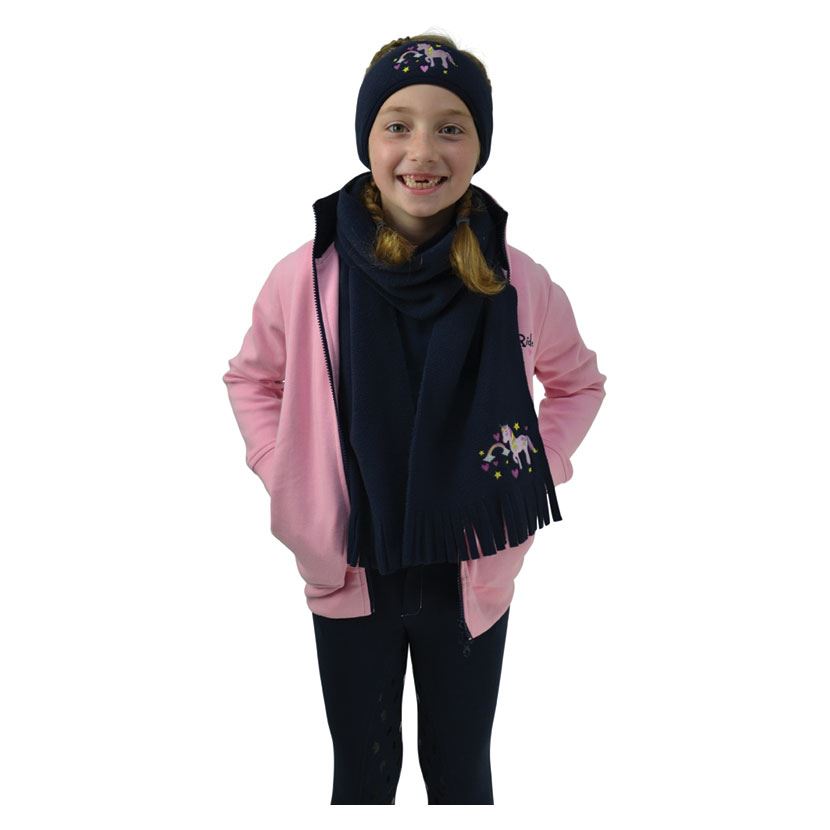 Indulge in this magically cosy accessory set for winter. The super-soft fleece head band with elasticated back will keep your ears warm in the cold weather, whilst the matching scarf will keep your neck snug. Available in Navy and Pink, embellished with the Little Unicorn design.