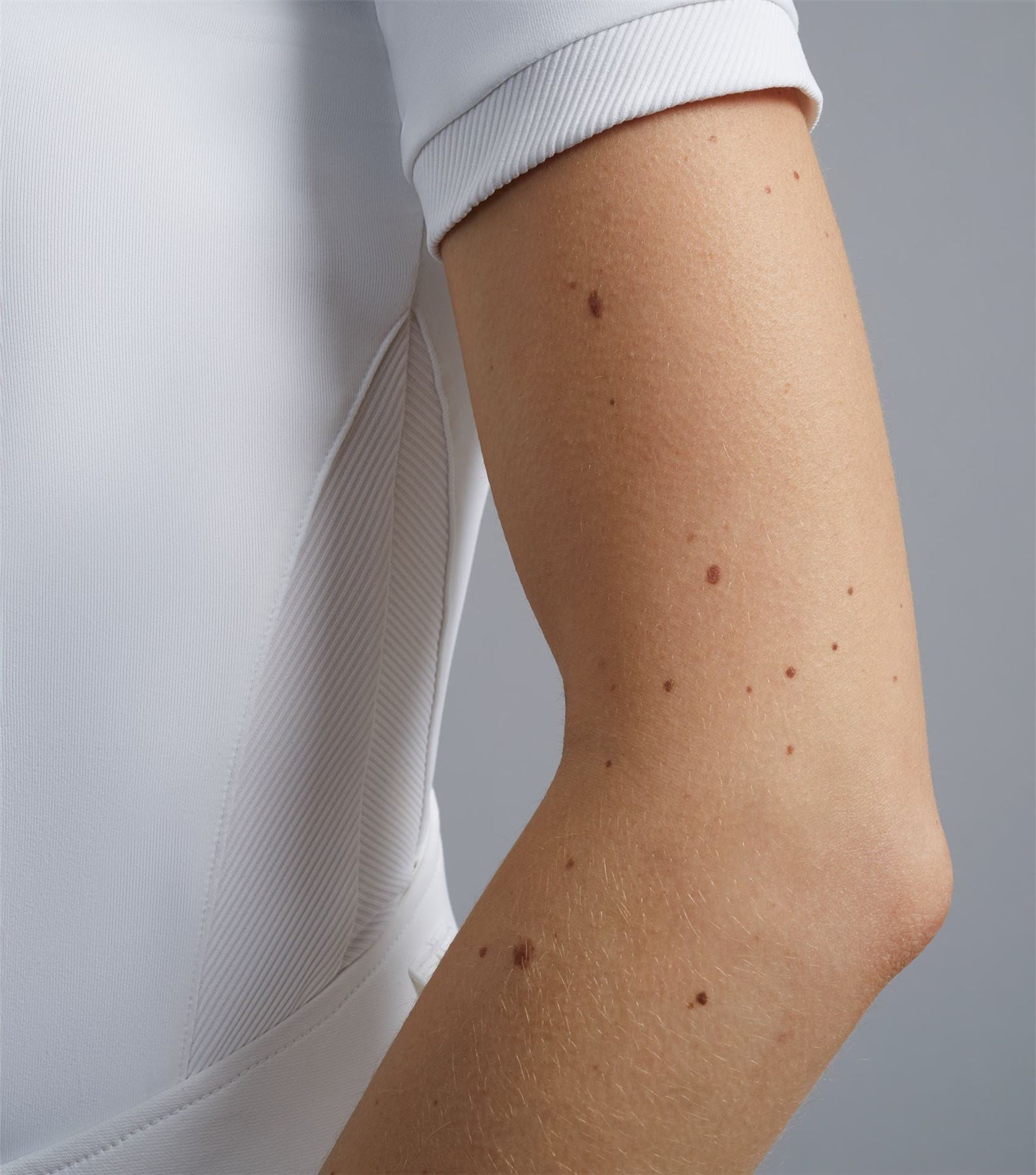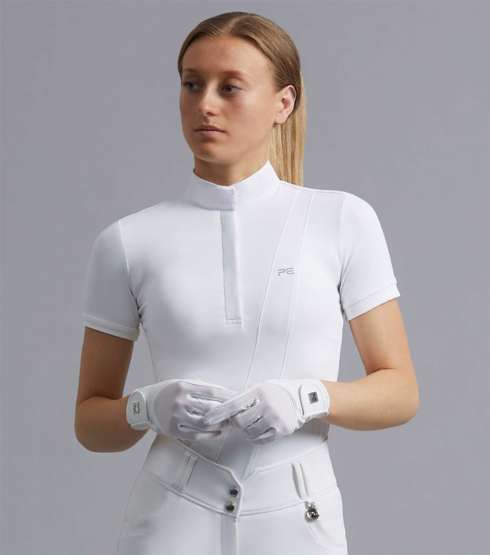 Hydropore technical performance jersey Super lightweight four-way stretch properties Moisture wicking/quick drying Breathable Cotton collar Across body panelling Hidden button stand Double snap button collar 'Premier Equine' embroidery