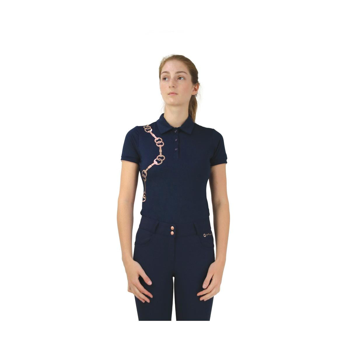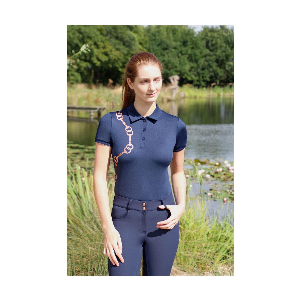 Timeless, classic navy polo top, with stunning rose gold detailing and tonal and contrasting stitching for subtle style. With rose gold bit print featuring on the front and side of the top, and stirrup on the base of the collar. The polo neck can be worn in the traditional style, or stood up for a bit of extra protection. This cool and comfortable top is an essential item for the upcoming summer!