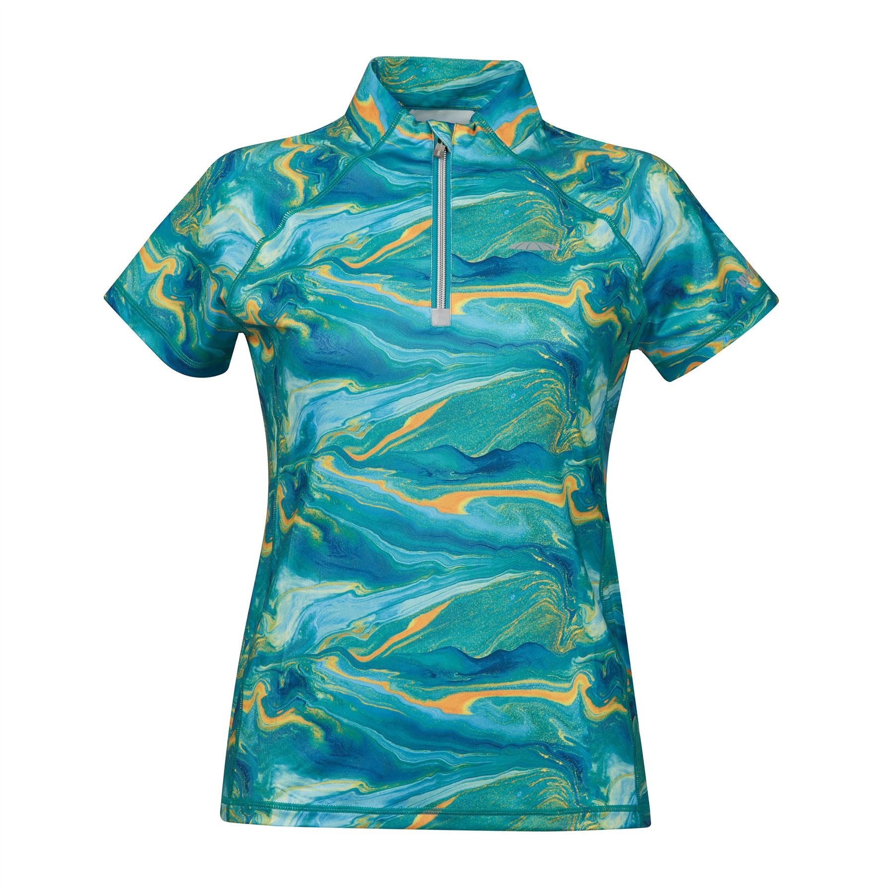 The WeatherBeeta Ruby Printed Short Sleeve Top offers bi-stretch jersey fabric for movement and comfort, making this is a great breathable base layer. The Comfort Dry Technology ensures any moisture dries quickly to keep you cool, comfortable and dry, with mesh side panels, under sleeves and back yoke for extra ventilation to keep you cool. Featuring a stand collar with 1/4 zip placket front and a slim fit for a flattering and marble printed stylish look. 90% Polyester/10% Elastane.