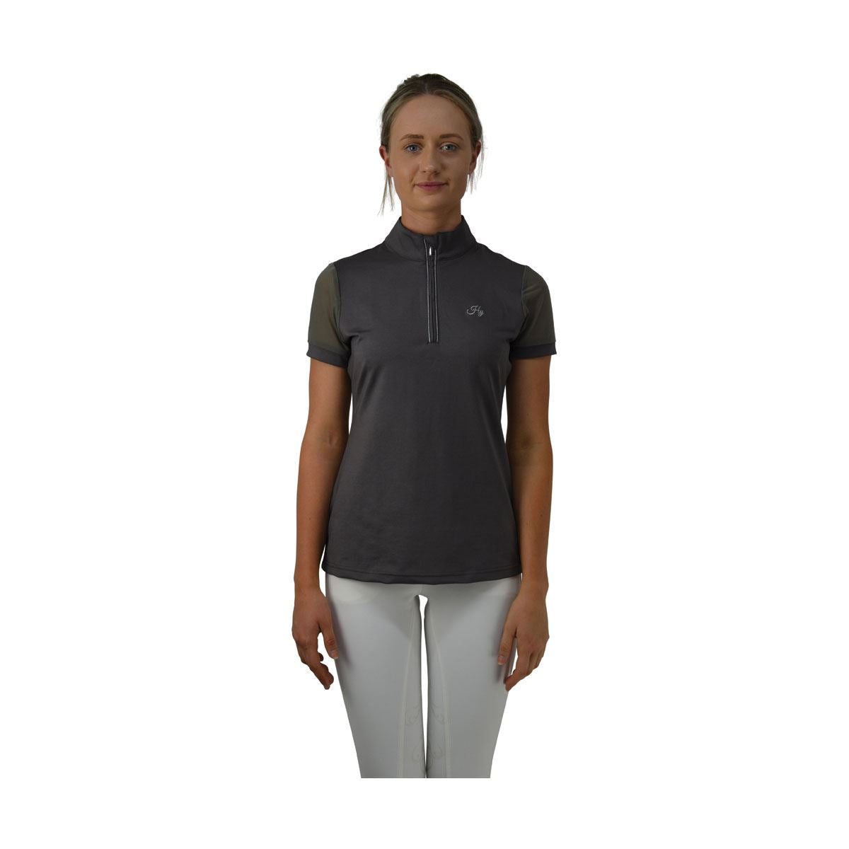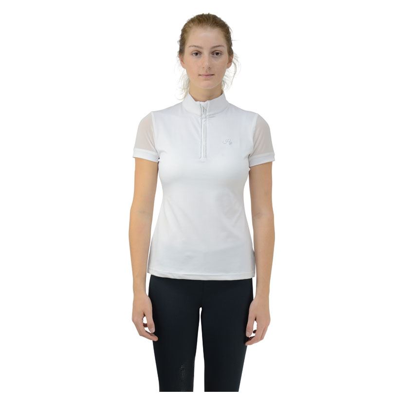 This elegant show shirt is on trend and beautifully designed with mesh sleeves and silver detailing surrounding the zip up collar. This high quality, breathable shirt is quick drying and comfortable with flexible material ensuring a cool feeling on a hot day. This shirt is feminine and sophisticated. Completed with the Hy detailing on the chest.