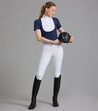 The Famosa Ladies Short Sleeve Competition Shirt is a stylish and elegant equestrian shirt designed to offer comfort and functionality. Made from high-quality, breathable fabric, this shirt provides excellent moisture-wicking properties to keep you cool and dry during intense riding sessions or competitions. The classic design is complemented by subtle yet sophisticated styling, making it the perfect choice for any rider. The shirt features a unique textured poplin bib at the chest, adding sophistication to the design. The intricate detailing on the bib enhances the elegance of the garment, showcasing the quality and style. This thoughtful addition sets the shirt apart, making it a standout piece in any equestrian wardrobe. The Famosa Ladies Short Sleeve Competition Shirt from the Black Label collection is a stunning white equestrian shirt that exudes elegance and sophistication. The pristine white colour adds a timeless and classic appeal, making it a versatile and stylish choice for any rider. The purity of the white hue accentuates the exquisite detailing of the shirt, allowing the textured poplin bib to stand out beautifully. Whether worn for intense riding sessions or competitions, the white colour of this shirt makes a bold yet understated statement, reflecting the pinnacle of refined aesthetics and elite performance. The high-stand collar adorned with embroidered PE branding adds a subtle yet stylish detail to the collar, demonstrating the attention to detail and quality craftsmanship that sets this shirt apart.