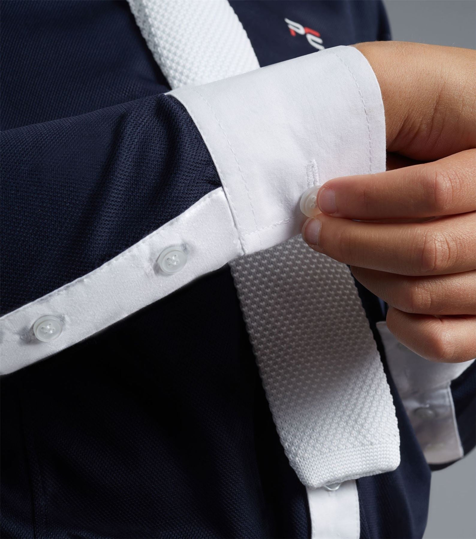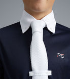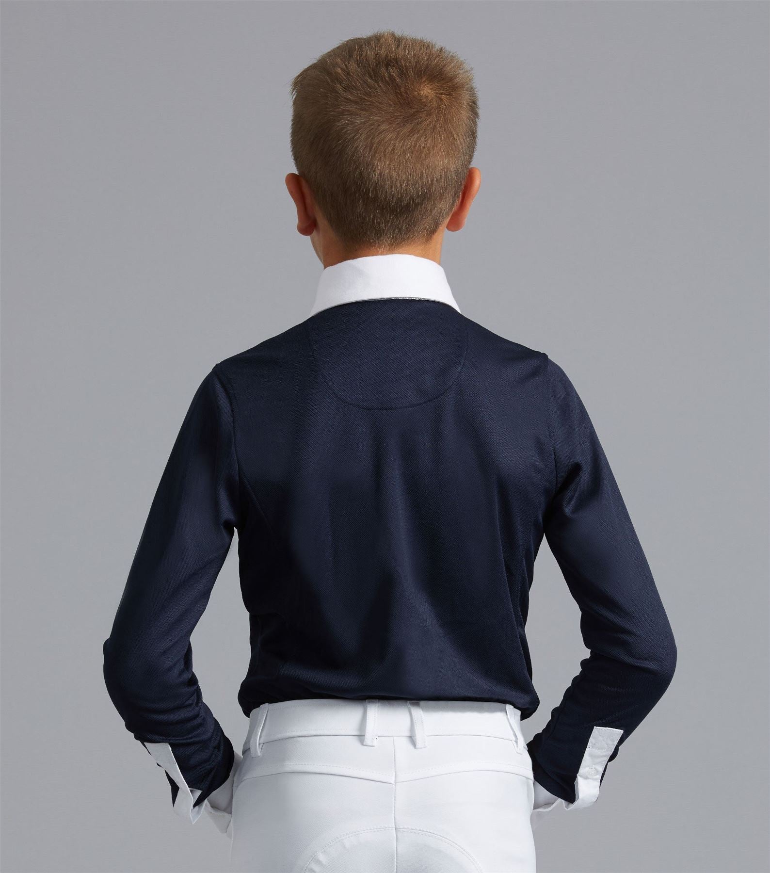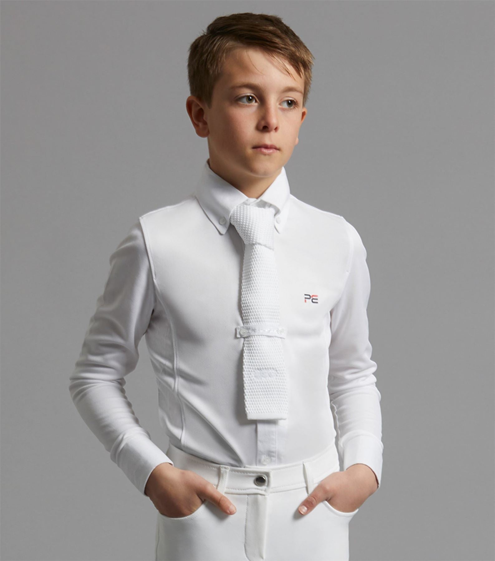 A sophisticated boy's competition show shirt engineered with technical four-way stretch pique jersey which boasts high breathability and moisture wicking properties, ideal for keeping cool and comfortable in the show ring. Combined with the technical body of fabric is a classic cotton poplin, button-down straight-point collar and button-up cotton poplin sleeve cuffs. A strategically placed tie loop enhances the smart look. A classically styled boy's long sleeved show shirt finished with flattering seam lines and subtle PE branding on the chest. Don't forget to take a look at our hard wearing and stylish kid's riding breeches. For a short sleeve alternative, please see the Mini Antonio Show Shirt.
