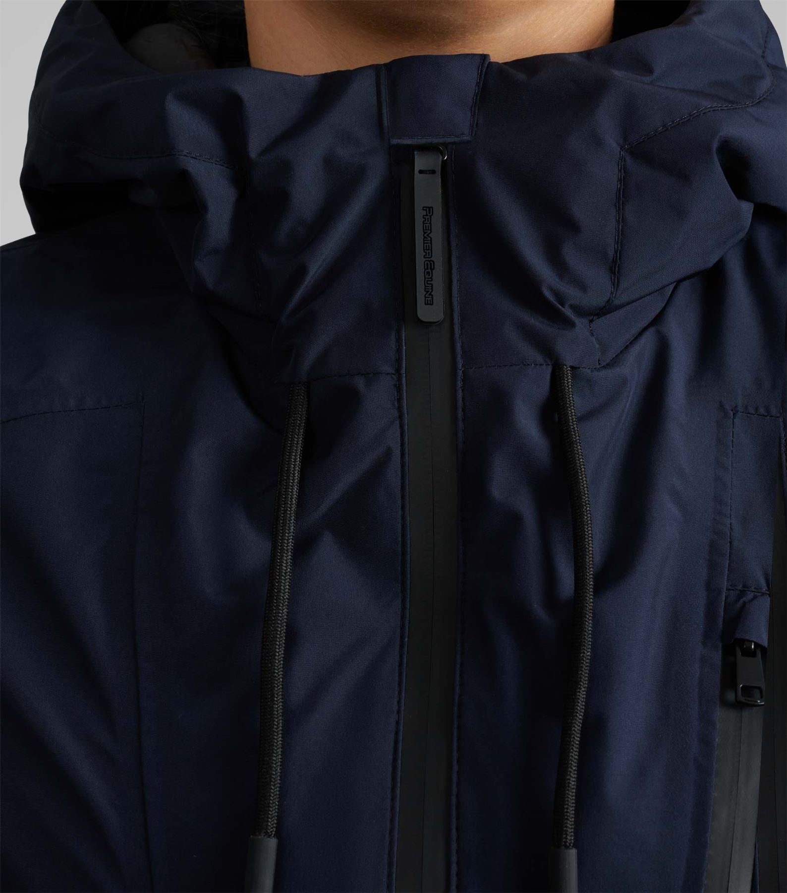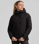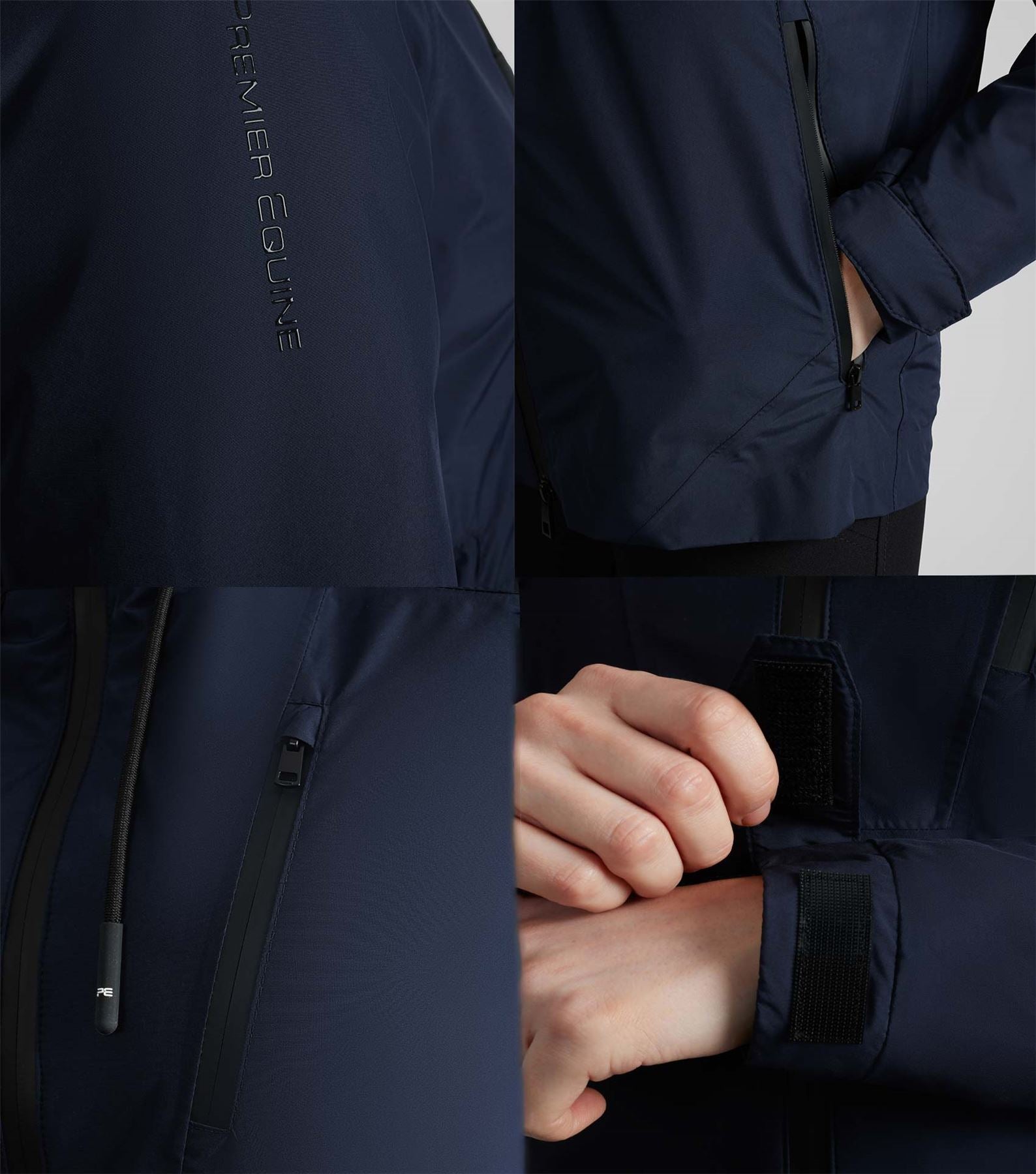 The Motet Ladies Waterproof Jacket delivers a classic timeless fit and and is the ultimate choice for the modern active equestrian. Crafted from technical waterproof materials, taped seams, and waterproof zips, this coat provides ultimate watertight protection against the elements. Designed with a relaxed fit, the Motet provides comfort to the rider allowing a personalised fit through Velcro adjustments on the sleeve cuff, an internal quilted lining for warmth, and a storm peak on the hood with an elasticated drawstring further enhancing protection against the wind and rain. The Motet Waterproof Jacket obtains desirable features being highly breathable and moisture wicking lining, anti-chill, and thermoregulating enabling the rider uninterrupted focus on performance and tasks. The regal, sophisticated shade of French Navy is complemented by black water-resistant zips and rubber zip pull. Three pockets on the front of this jacket, one situated on the riders left chest, enhances the versatility offering a place to store your personal belongings. A PE chrome badge on the wearers left arm boasts quality, whilst subtle tonal branding on the jacket delivers an elegant, sophisticated aesthetic of this BLACK LABEL jacket. The BLACK LABEL collection focuses on high-quality fabrics and technical materials which represent the pinnacle of refined aesthetics, elite performance, and timeless craftsmanship.