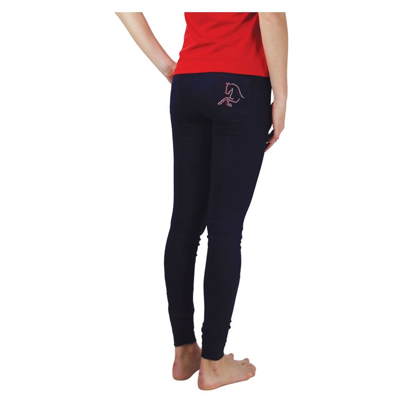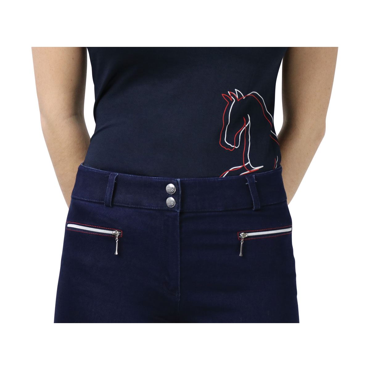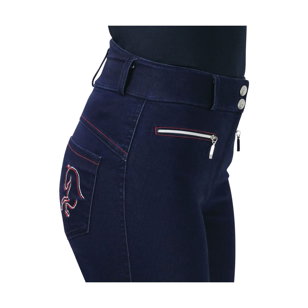 These high waisted breeches are ideal for the active rider! The soft, flexible denim stretch material will keep you comfortable, whilst still allowing you to perform at your best. Handy front zip pockets, and two deep rear pockets featuring the Richmond horse silhouette, ideal for keeping items safe. With grippy, silicone knees for extra security whilst in the saddle and non-bulk stretch hem ankles to ensure optimum comfort when wearing long boots or socks. With pretty red detailing to match the rest of the Richmond collection.