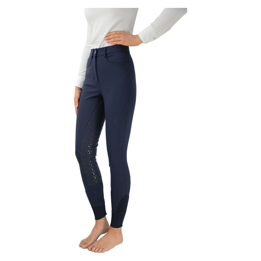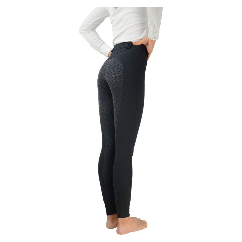These stylish breeches with a full silicone seat in unique Hy Signature honeycomb pattern, offer excellent comfort and performance. Additional features include silver Hy logo detail on the lower leg, belt loops, stretch lower leg cuffs and zip fastening with hook.