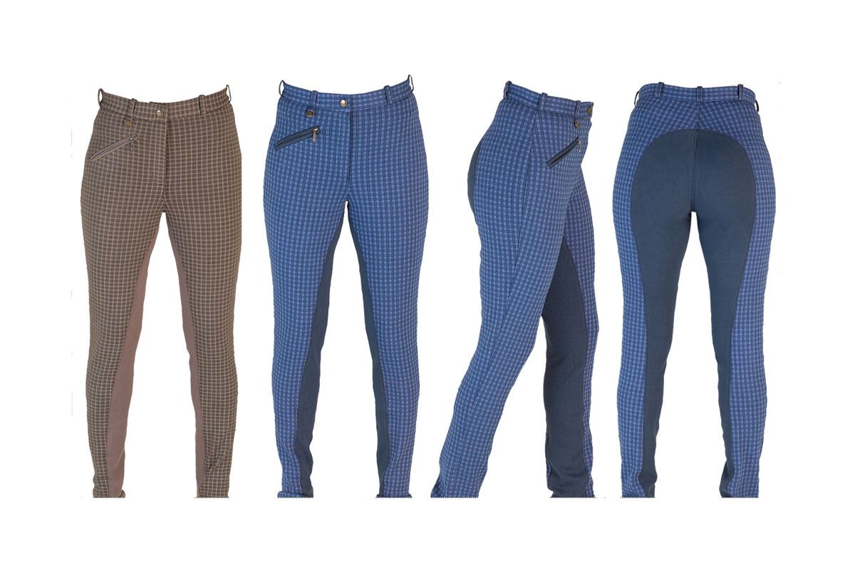 Fashionable two tone check printed knitted jodhpur with plain seat. Classic cut, comfortable and flattering in style. Premium weight 94% Cotton and 6% Spandex for great 4 way stretch and comfort. Featuring discreet front zip pocket, full zip fly, belt loops, reinforced stitching and elastic boot strap at the ankles (removable) with rolled up bottoms. Machine washable at 40°C. Leg length: Regular. Make a fashion statement today! A must have product.