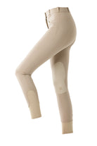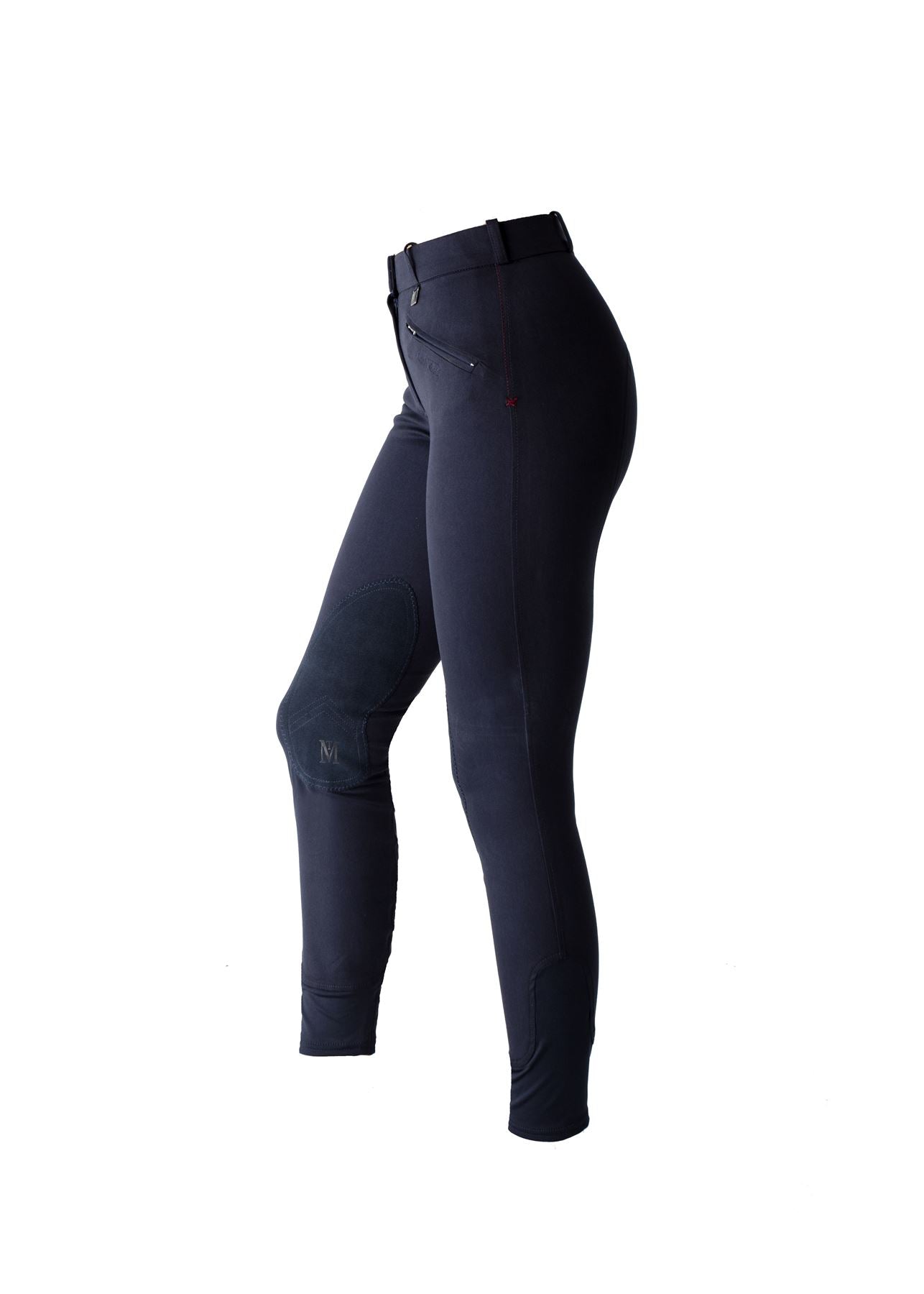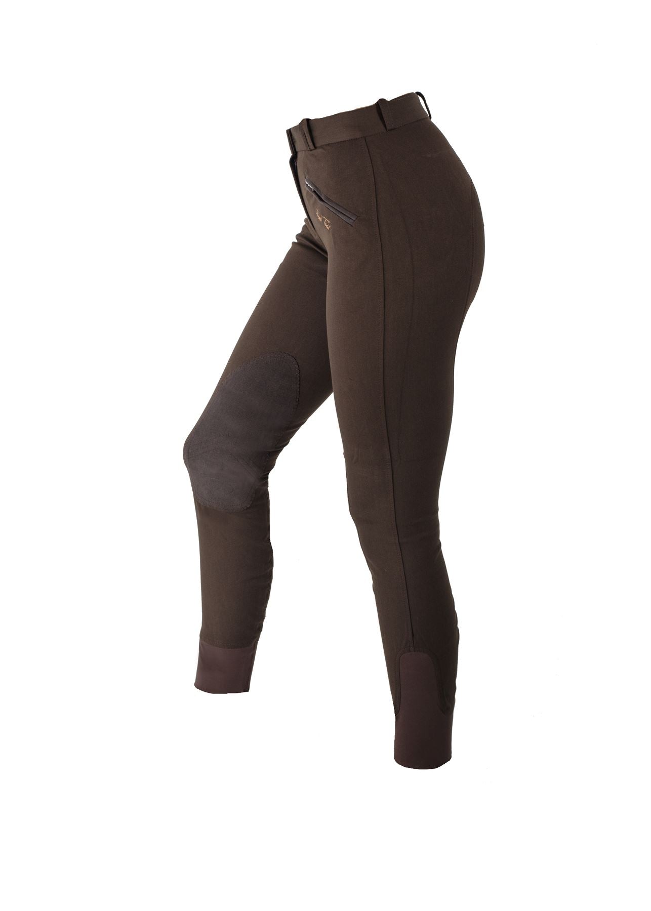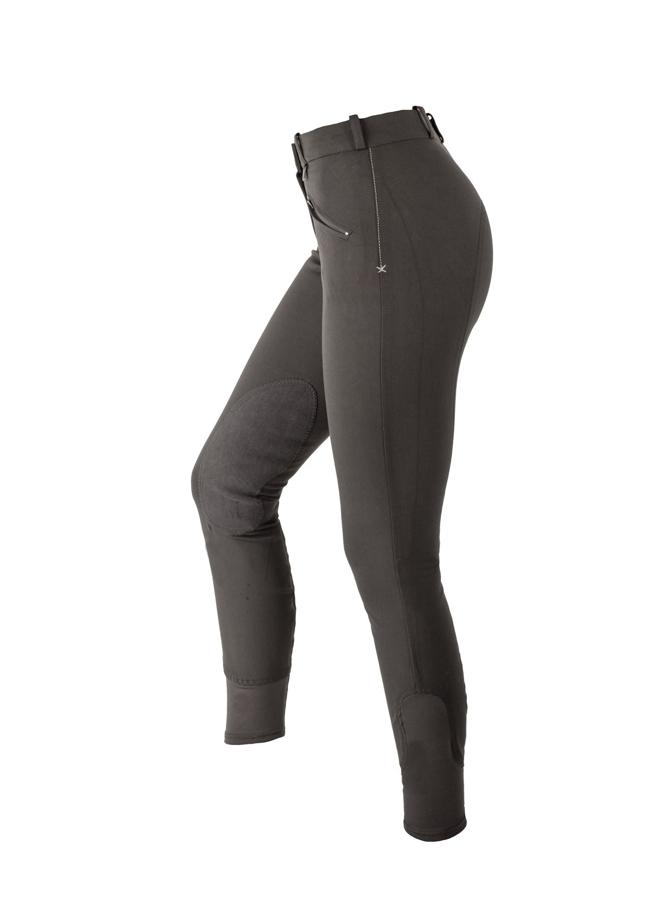 Ever popular ladies breeches which are both practical and smart, making them ideal for competing or riding at home. Made from a combination of cotton, polyamide and elastane, they are breathable, durable and have a 4-way stretch. Features include a euro seat design with ultra grip knee patches, plus slimline elasticated sock ankle, two zipped pockets and a wide 4cm waistband with belt loops.