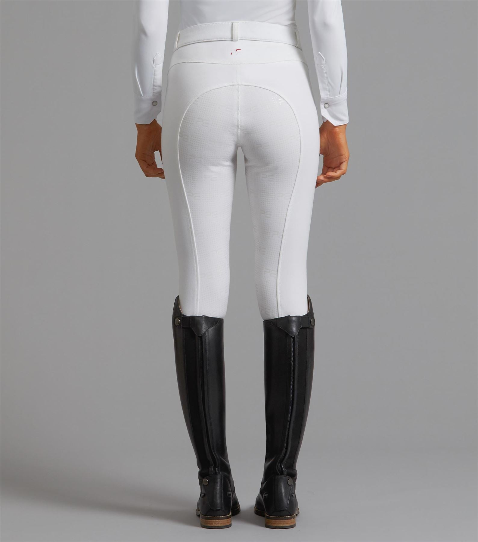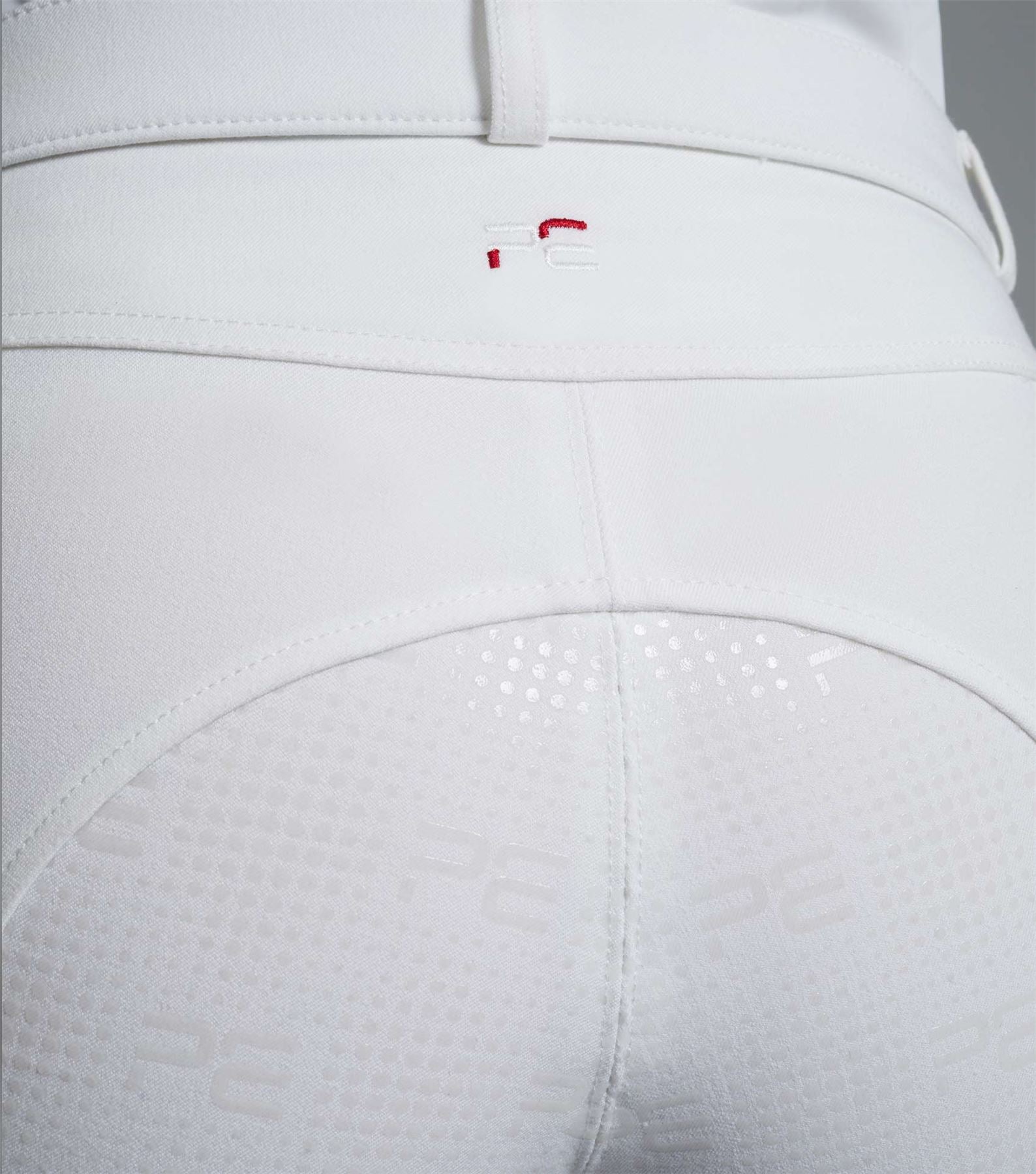 Breathable 4-way stretch Standard rise waist Curved pocket design Silicone gel full seat grip Tailored fit PE branding 5 traditional belt loops