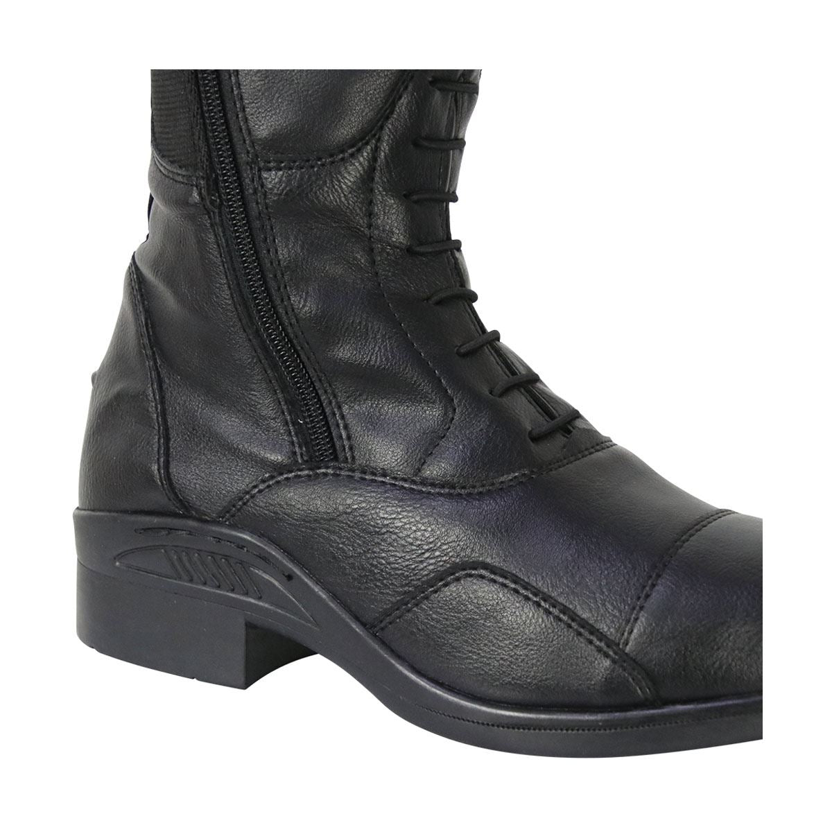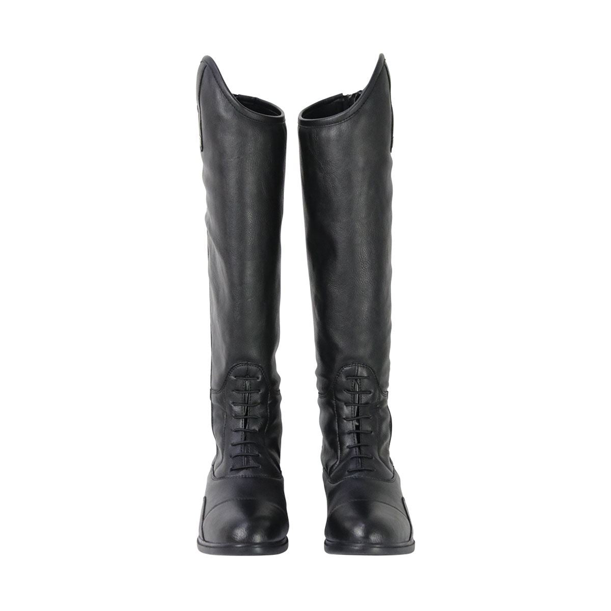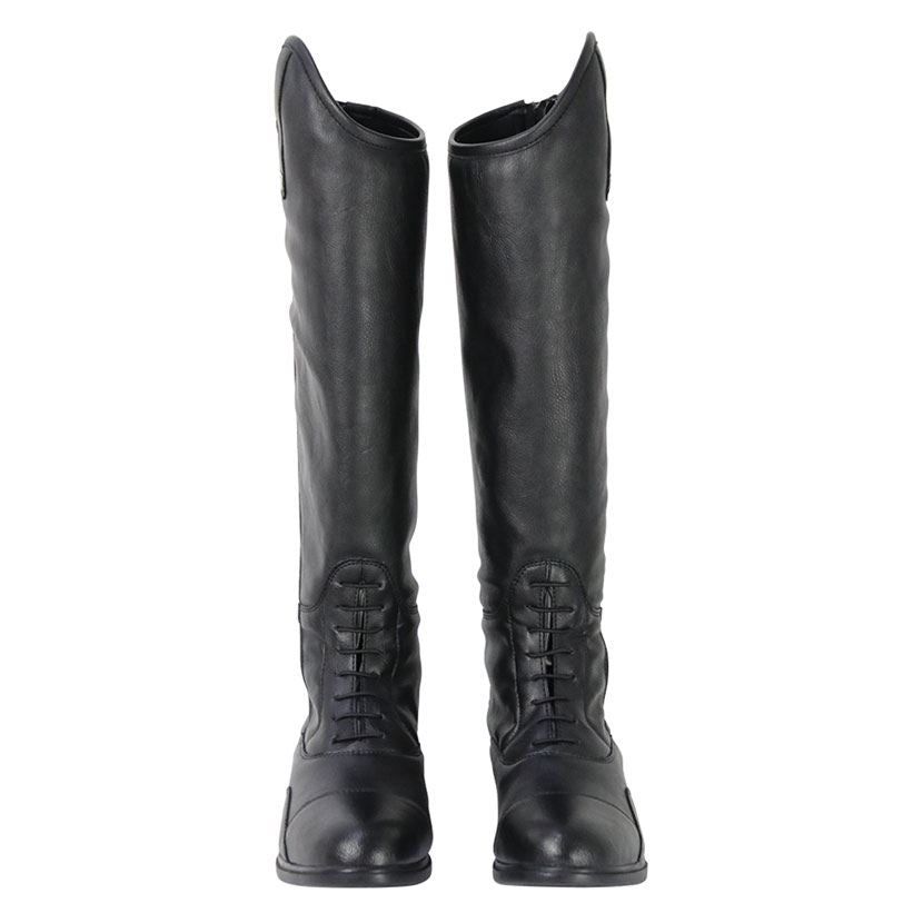 A twist on the classic riding boot! This elegant long boot is fitted with lace fronts and is perfect for the competitive or everyday rider. Featuring a fashionable sweeping side zip and an elasticated back panel that allows for a streamlined fit and added comfort. The heel incorporates a rubber spur studs for optional use, and is finished with an elasticated press stud at the top for a secure fit. Fully lined for added comfort and sitting on an anti-skid sole, this secure, well-fitting boot is an excellent choice for competing or schooling.