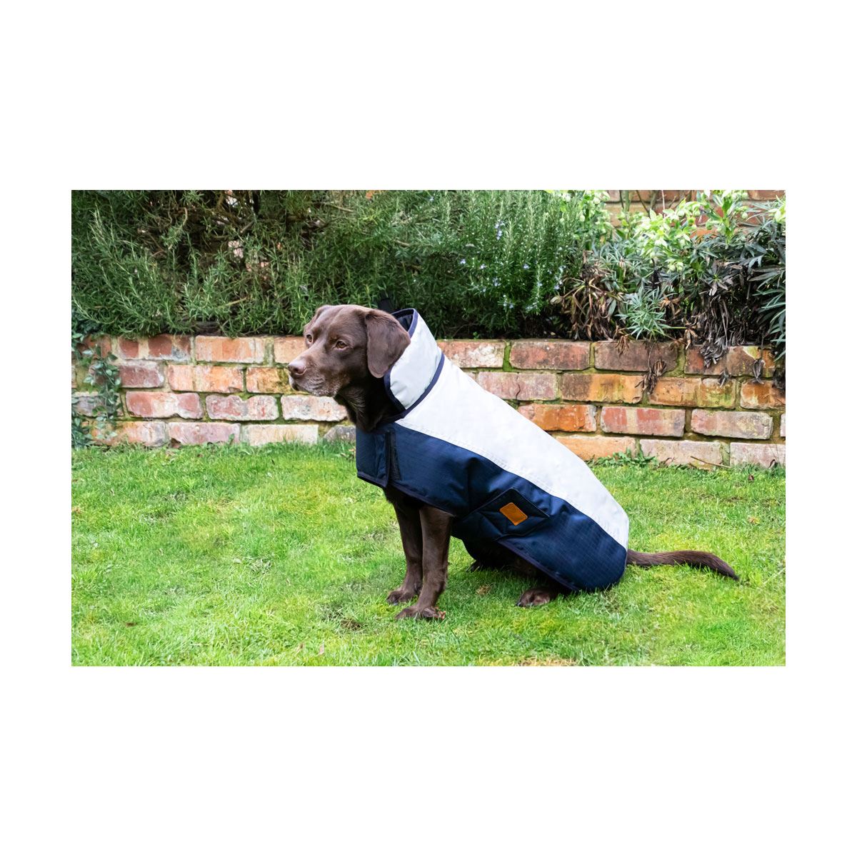 This practical and stylish dog coat is a made from a 600 denier outer and features a warm 100g fill to keep your dog toasty. With a reflective silver top half and collar to create optimum visibility whilst out walking your dog - perfect for the winter months and finished with a smart navy bottom half and strap. The coat is secured safely in place with adjustable back leg closers and touch tape fastenings. With additional collar to offer your dog even more protection, this dog coat also features lead hole for practicality and leather binding for a stylish look. Finished with Benji & Flo leather look logo and tonal stitching.