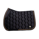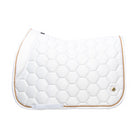 The luxury Marygold Saddle Pads are meticulously crafted from a deluxe silk material with hexagonal logo quilting for a classy and sophisticated style. These pads have been anatomically designed with a high wither that is supported by unique memory foam stop cushions. These provide optimum clearance and comfort which allows for a secure fit and freedom of movement, therefore assisting with improving performance. The moisture-tec lining ensures breathability and airflow when your horse or pony need it most, which when partnered with the quilted design assist with relieving pressure from under the saddle to even distribute weight. Golden pin detailing with leather backing and delicate gold braiding finish off this stunning saddle pad for a high-end look and feel. Perfectly matches with the Marygold horse wear and Ednam rider wear for an on-trend co-ordinated style.