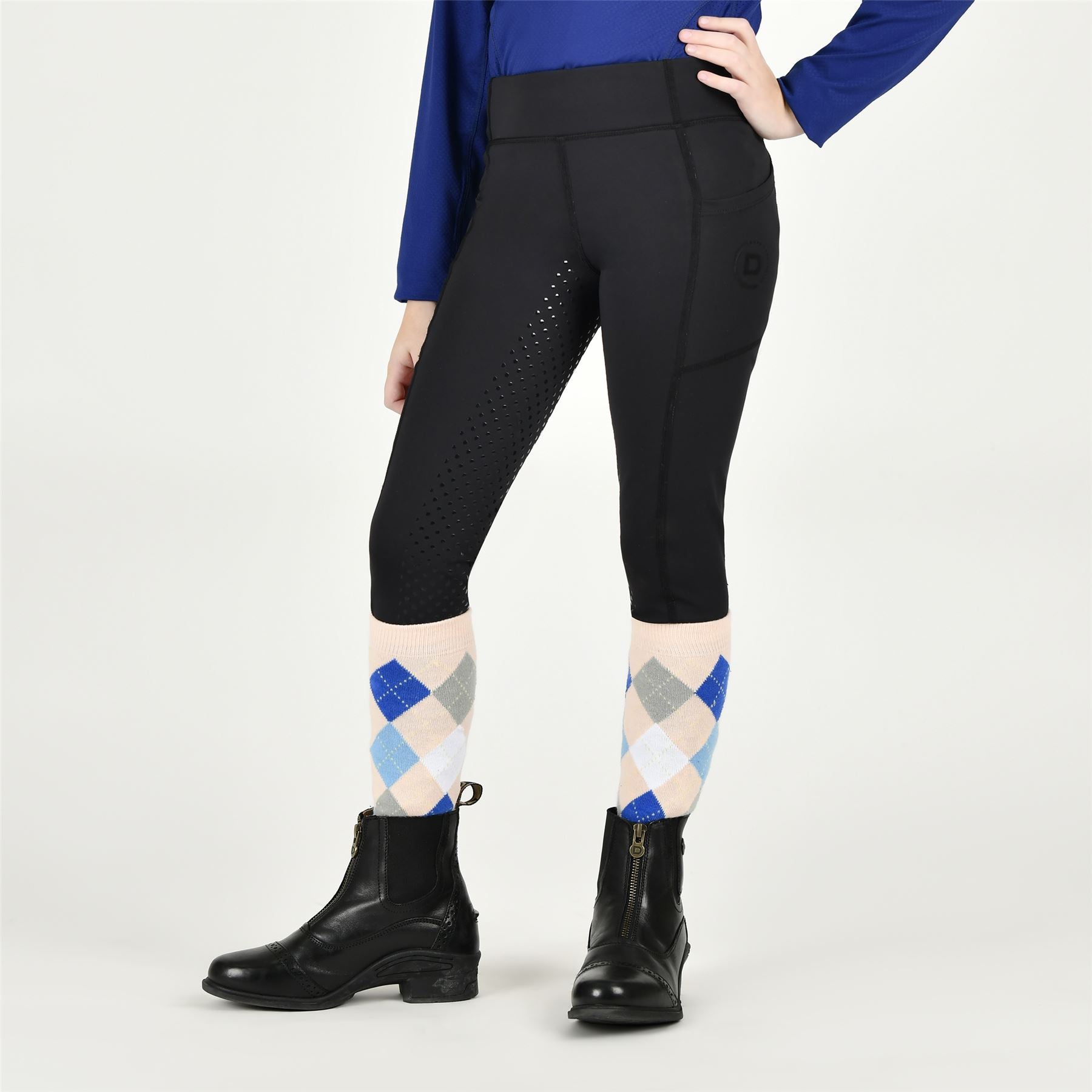 The Dublin Kids Everyday Riding Tights combine comfort, support and style. These full seat tights are perfect for riders who need an extra boost. The mid rise wide waistband and Comfort Dry Technology ensures all-day comfort, offering essential support while keeping you comfortable with every ride. The side pockets provide the perfect place for your phone and other items, while the gel grip keeps your items secure. With our 4-way stretch, these tights move with you as you ride, ensuring maximum comfort and freedom of movement with every stride. When it comes to superior comfort and support, Dublin Everyday Riding Tights are the perfect choice. Whether you�re out for a leisurely ride or competing in a show ring, these tights will keep you comfortable and secure, while looking your best. These horse riding tights are available in Black and Naval Academy (Navy).