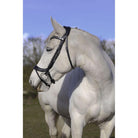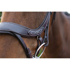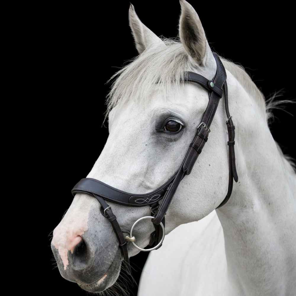 The bridle is further enhanced by a perfectly positioned throat lash sitting at the correct angle to relieve pressure under the chin. The bridle is also set off with a dipped browband, removeable with our signature "e-clasp" that feeds through a padded channel offering yet more comfort to the sensitive lower ear.