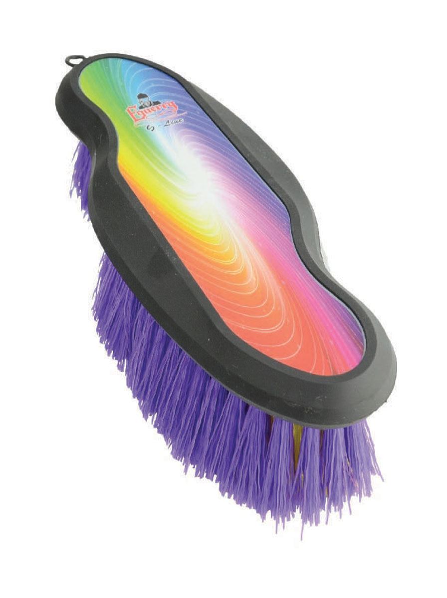 An ergonomic handled body brush with a multi-coloured handle and medium length colourful bristles.