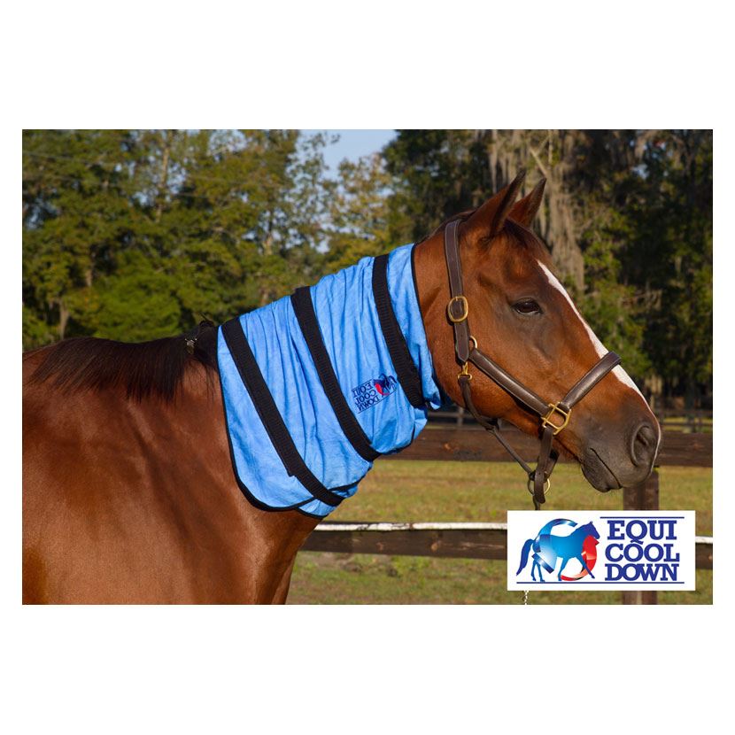 Fits up to 18-Hand Horses (60 x 63)! Cool your horse's core temperature quickly with Equi Cool Down's body wraps. Ideal for recreational riders who want to improve their horse's comfort. Excellent for competition riders who need rapid stabilization of core temperature to give their horse a more competitive edge due to quicker recovery from exertion. PERFECT for horses suffering from Anhidrosis (""No-Sweaters"") and other heat-related problems. The versatile "one-size-fits-most" design of these body wraps is achieved using flexible and adjustable leg and chest straps. Their design ensures that the body wrap will be held in place while still enabling your horse to move around with minimal restraint. May significantly alleviate symptoms arising from Laminitis, Allergies, Thermoregulation, Cushings Disease & Inflammatory Airway Disease. The revolutionary Equi Cool Down wraps will put an end to the days of continuous hosing and scraping. To activate the cooling mechanism, simply spray with water and wave! The wraps contain NO gel, NO beads or crystals, NO frozen inserts, NO electricity needed. Equi Cool Down wraps gently cools effected areas, eliminating the risk of tissue damage from extreme cold. If the wrap feels warm to the touch after a few minutes that simply means it is working! To reactivate the cooling the process, spray the wrap with water, warm or cold, and walk horse or flap sides to infuse air flow. It is THAT easy. Equi Cool Down wraps are safe to place directly on your horse. No cover or sock is needed to keep the wrap debris free. If it gets dirty, simply hose it down, hand-wash or even put in your washing machine with a mild detergent. Use over and over again; Equi Cool Down wraps will still get cold! On a trail ride not even remotely close to a hose? Trailering your horse? Any source of any temperature water will work; a pond, a well, a swimming pool - just fill a spray bottle and spray the wrap down. Keeping the wrap wet is the key to all-day coolness. These wraps are truly the most innovative product to hit the equine market! Before using your new Equi Cool Down products on yourself or your horse, please be sure to read our instructions for use and watch our care & use video for maximum benefits. This will ensure that the products have sufficient water to do their job and keep you and your horse cool, while allowing circulation and not becoming over-saturated which can actually inhibit air flow and cooling effect. If you have any questions, please contact us.