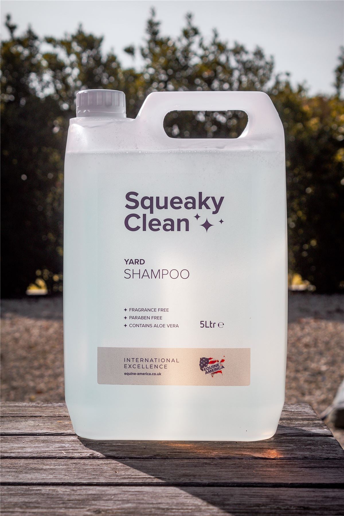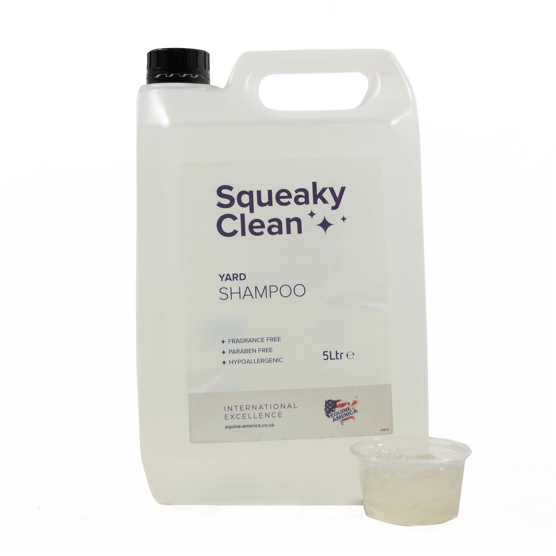 Squeaky Clean Yard Shampoo, carefully formulated to be suitable for all horses and ponies. Hypoallergenic, fragrance free and paraben free. With aloe vera for its calming properties and promotes a healthy and shiny coat. Available in a large 5 litre container to ensure you have plenty for the whole yard!