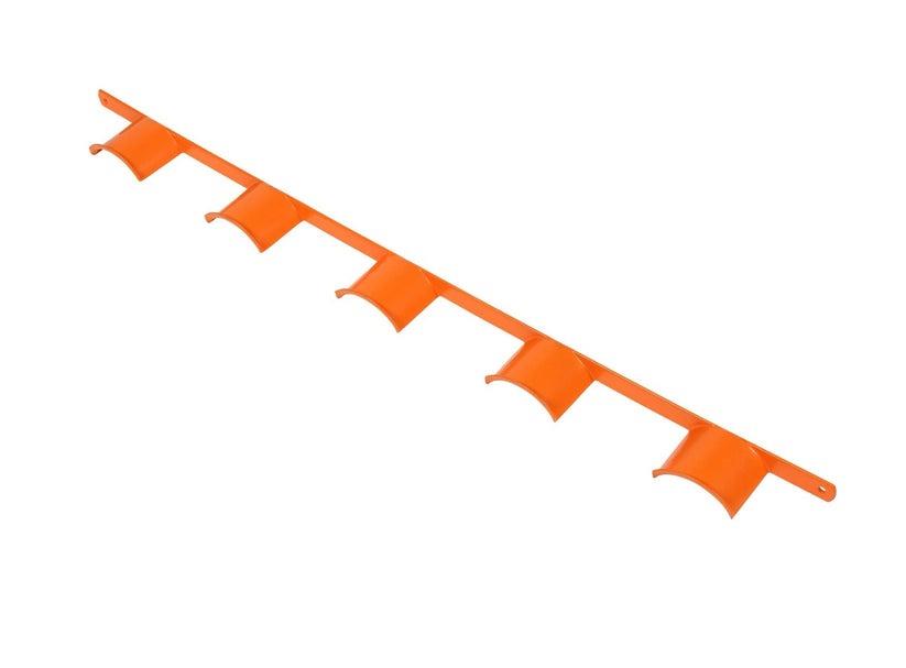 Wall hanging plastic coated rack to hold five bridles. Total length: 101cm.