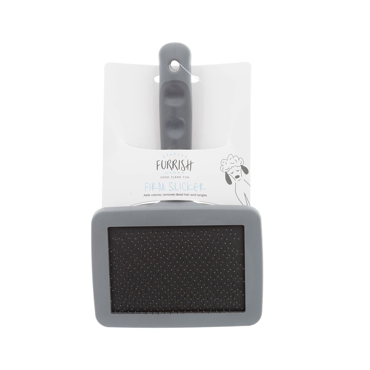 This firm slicker brush helps remove gentle tangles and dead hair while helping to add volume to the coat. The firm cushioned pad easily takes on the slightly thicker coats that need that little bit of extra work! Brush your Furrish friend in comfort with the rubber grip handle.