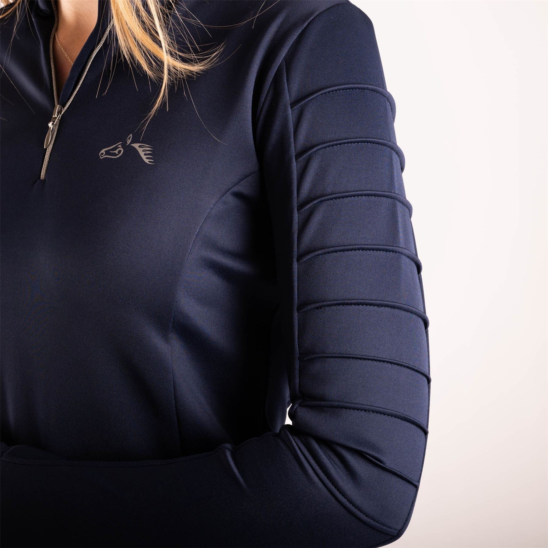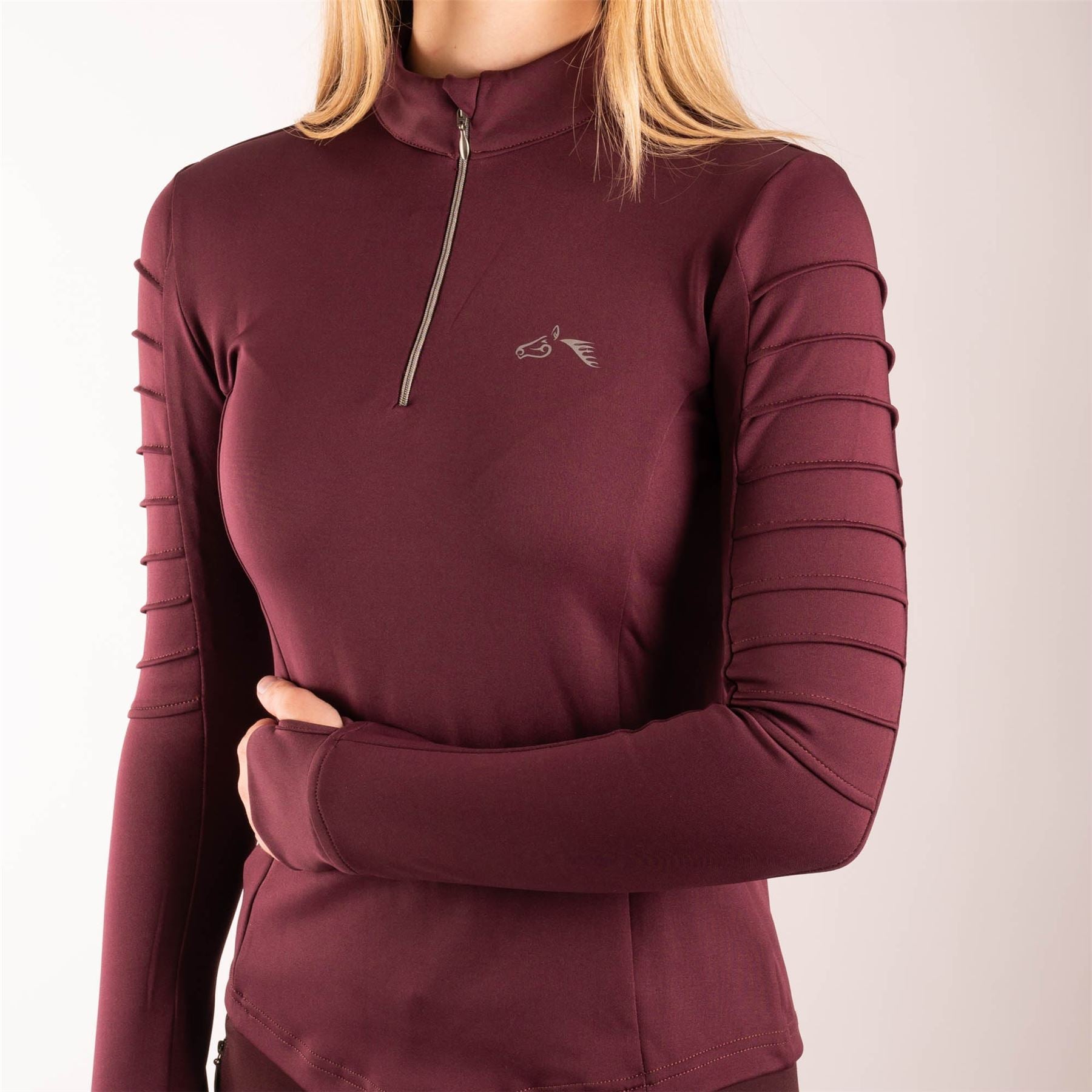 New for Autumn/Winter 2021 our Sophia Base Layer comes designed with an elegant pleated step design along the arms, to match the Sophia Riding Tights.This quality base layer is perfect for everyday riding and make for a stylish addition to your riding wardrobe.Featuring thumbholes and a high neck for use as a cold weather layer, they are breathable and the perfect choice to wear on their own for summer., All Way Stretch, Chafe-Resistant, Mositure-Wicking, UPF Protection, YKK ZipperColours: Burgundy & Navy.Sizes: Extra Small, Small, Medium, Large, Extra Large