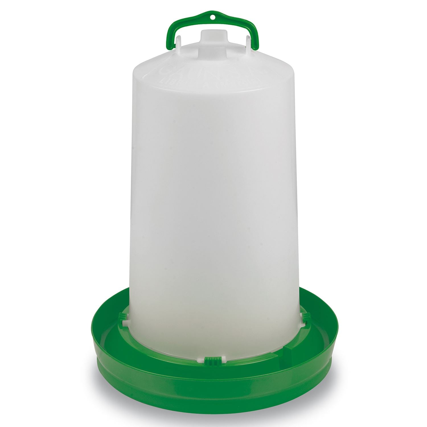 Tough and durable plastic drinker designed for chickens and game birds. Can be used freestanding or has a reinforced handle for hanging. The water tank is semi-transparent to allow you to easily view the water level.The handle folds away enabling the drinker to stand upside down whilst you fill it. The 5lt drinker's height is 21cm and the diameter is 31cm.