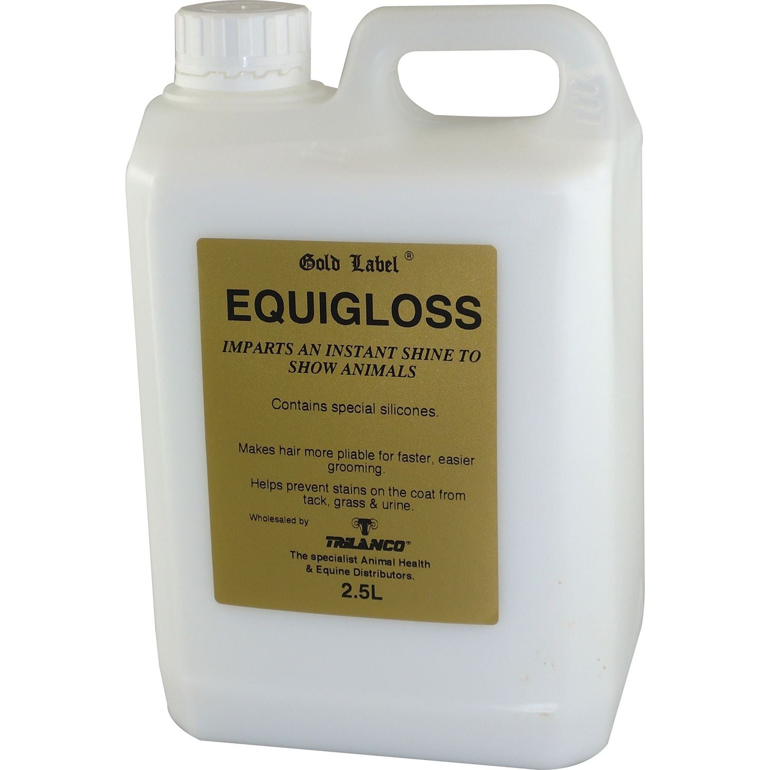Shop now at Just Horse Riders for the Gold Label Equigloss, a premium product designed to give your show stock an instant glossy sheen. This unique formula not only makes hair more manageable for quicker, hassle-free grooming, but it also aids in preventing unsightly stains from tack, grass, and urine. It's important to note that it contains no mineral oil, making it a safe choice for your horse's coat. With our quick dispatch and delivery, you can have this high-quality product at your doorstep in no time. Any questions? Feel free to contact us and experience our top-notch customer service today.