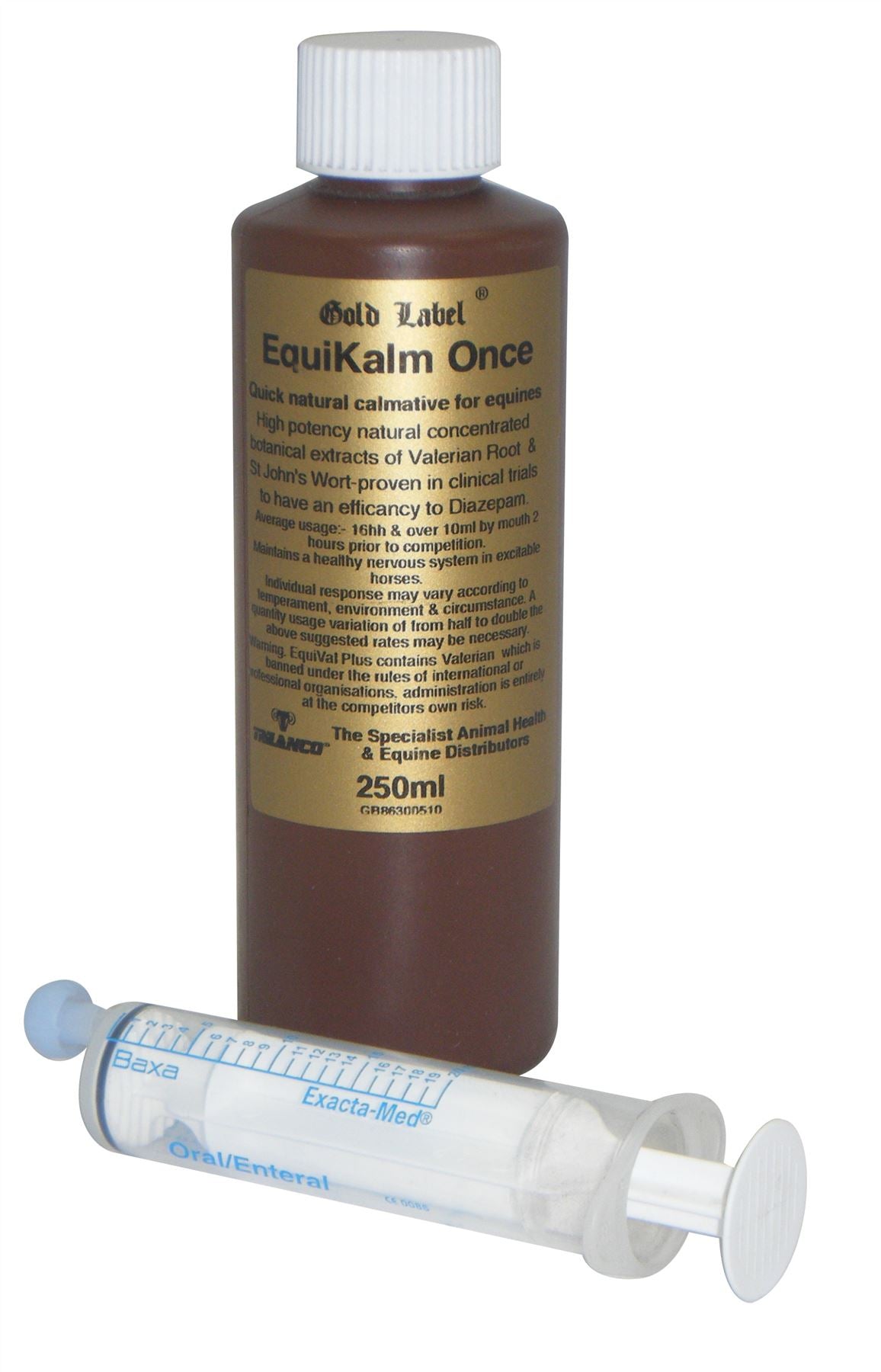 Shop now at Just Horse Riders for the Gold Label Equikalm Once. This product is specifically designed for short-term use on equines that are prone to excitement. Within just two hours of administration, this effective calmative starts to take effect and can last for about four hours. It features a potent, revised formula that includes concentrated herbal root extracts. These extracts work in unison to provide the best results. Please note, however, that this product is not suitable for use under rules. With our quick dispatch and delivery, you can rest assured that your product will reach you promptly. For any queries, feel free to contact us. Our high-quality customer service is always ready to help you.